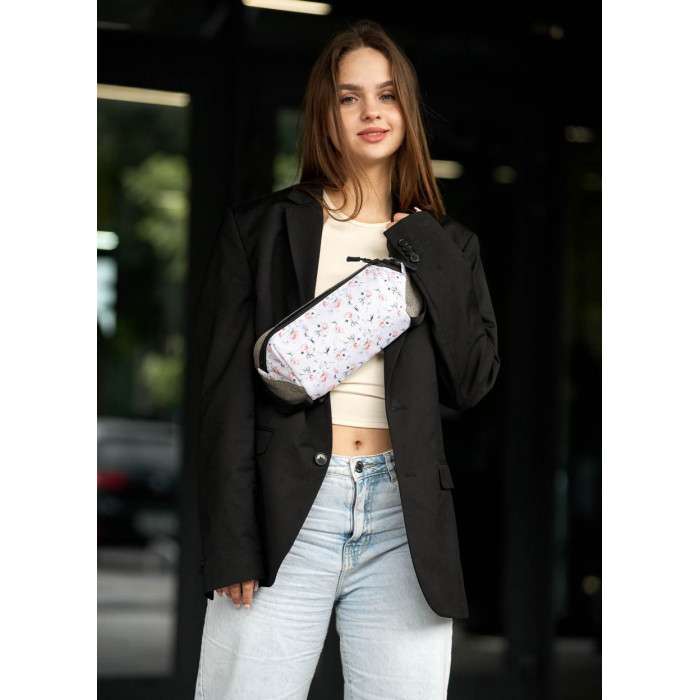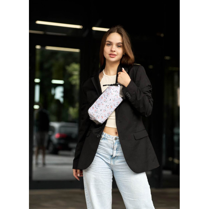 Женская сумка на пояс бананка Sambag Holster MSH серая тканевая с цветочным белым принтом
