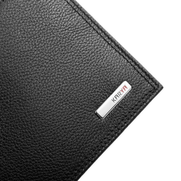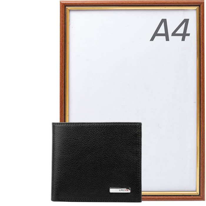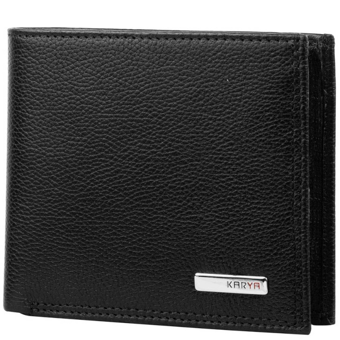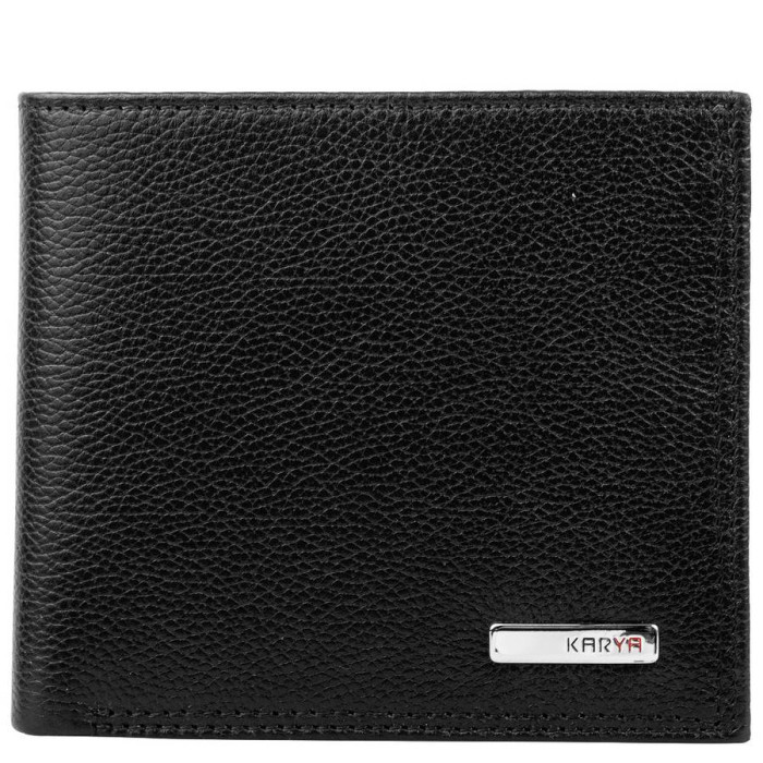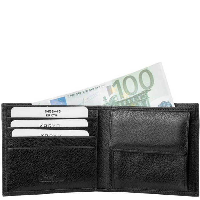 Количество основных отделений (для купюр): 2. Дополнительные отделения: 2. Отделения для визиток, банковских и дисконтных карт: 4. Отделения для мелочи: 1. Монетница закрывается при помощи клапана на механической кнопке. Материал изделия: кожа. Цвет изделия: черный. Цвет фурнитуры: серебро. Размеры (X*Y*Z): 11*9,5*2 см. Ширина в раскрытом виде - 22 см. Аксессуар изготовлен без застежки. Изделие упаковано в фирменную картонную коробку. Страна происхождения торговой марки Karya - Турция. Гарантия: 1 месяц.