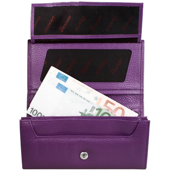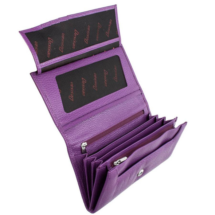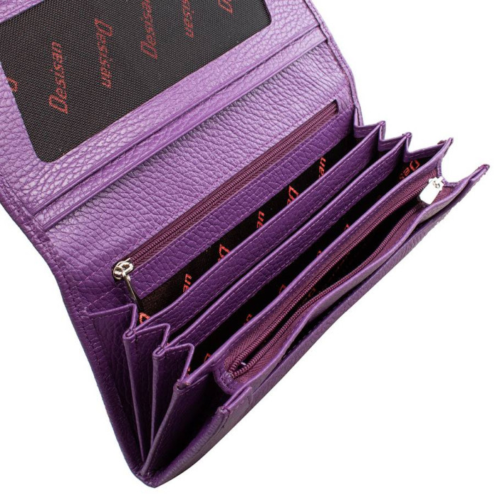 Добротный, большой и очень красивый кошелёк предлагает Вам торговая марка DESISAN и наш магазин. Эта модель фиолетового цвета выглядит замечательно. Первосортная натуральная кожа представлена во всей красе – однотонное изделие с полноформатным клапаном позволяет сполна оценить аккуратность и безупречность образа. Его украшение - отделочные строчки нитями в тон, выполненные строго по краю, и небольшая металлическая эмблема турецкого бренда, расположенная в нижем углу. Такую вещь приятно брать в руки, а ещё лучше – пользоваться ею каждый день. Количество отделений, карманов, дополнительных отсеков, прозрачных окошек удовлетворит нуждам даже самой взыскательной покупательницы. В интернет-магазине купить просторный высококачественный кожаный кошелёк-портмоне можно по разумной цене.
