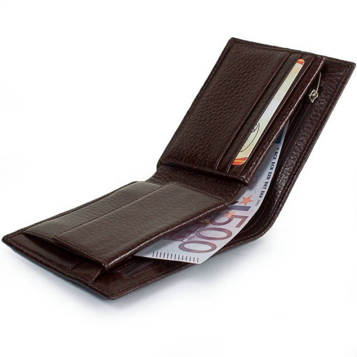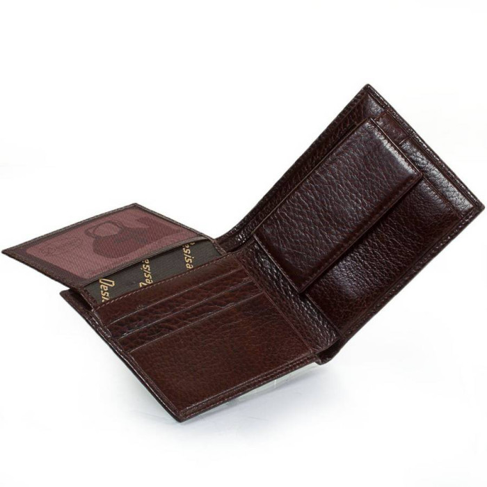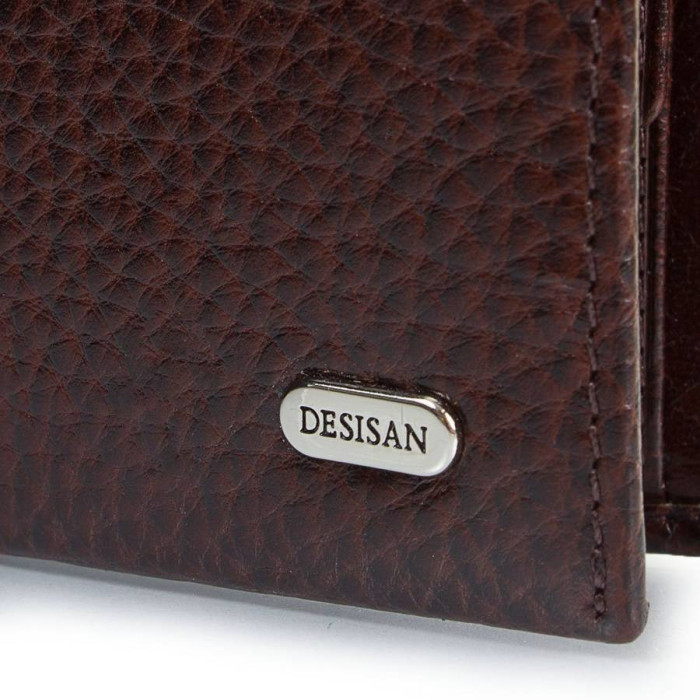 Количество основных отделений (для купюр): 2. Дополнительные отделения: 1. Отделения для документов, фотокарт и пропусков: 1 (имеет прозрачное окошко). Отделения для визиток, банковских и дисконтных карт: 6. Отделения для мелочи: 1. Карман-монетница закрывается при помощи клапана на механической кнопке. Прорезные карманы: 1 (на молнии). Материал изделия: кожа флотар. Цвет: бордово-коричневый. Цвет фурнитуры: серебро. Размеры (X*Y*Z): 12*10*2,5 см. Ширина в раскрытом виде - 24 см. Аксессуар выполнен без застежки. Изделие упаковано в картонную коробку. Страна происхождения ТМ Desisan - Турция. Гарантия: 1 месяц.