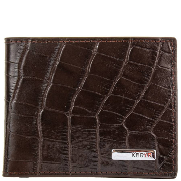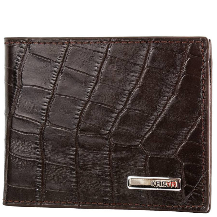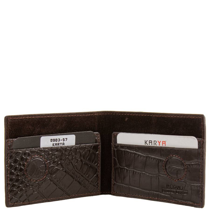 Размеры (X*Y*Z): 10*7,5*1 см. Ширина в раскрытом виде - 20 см. Количество основных отделений (для купюр): 1. Отделения для визиток, банковских и дисконтных карт: 2. Материал изделия: кожа под змею. Цвет изделия: темно-коричневый. Цвет фурнитуры: серебро. Кошелек закрывается при помощи магнитной застежки. Изделие упаковано в фирменную картонную коробку. Страна происхождения торговой марки Karya - Турция. Гарантия: 1 месяц.