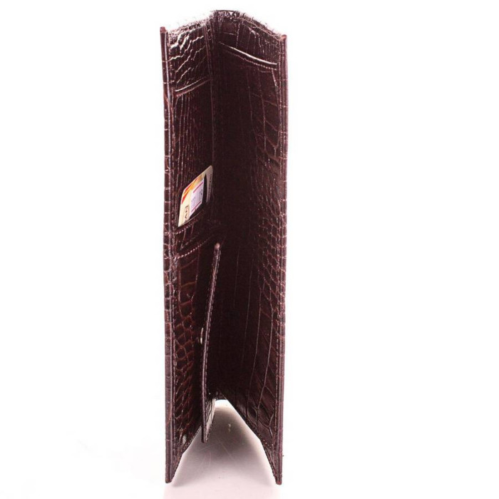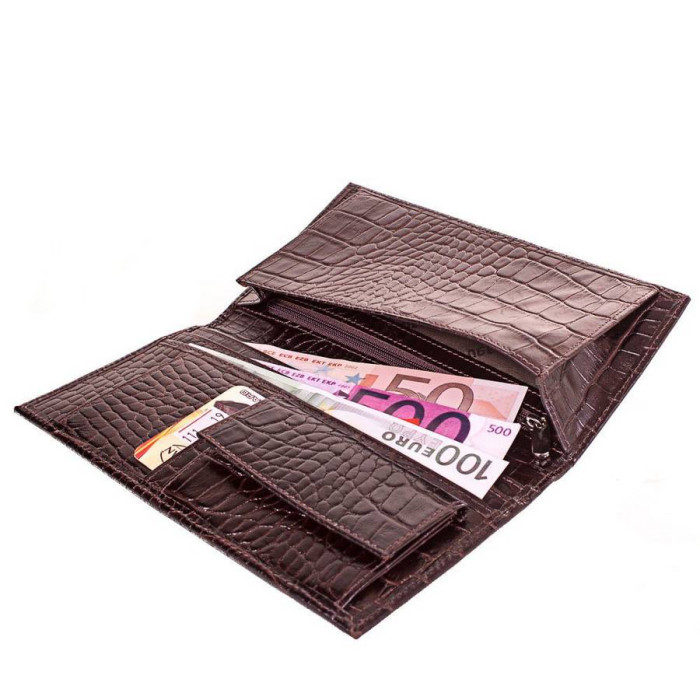 Количество основных отделений (для купюр): 1. Дополнительные отделения: 3. Отделения для визиток, банковских и дисконтных карт: 2. Отделения для мелочи: 1. Монетница закрывается при помощи клапана на механической кнопке. Прорезной карман на молнии: 1. Материал изделия: кожа под крокодила. Цвет: коричневый. Цвет фурнитуры: серебро. Размеры (X*Y*Z): 10,5 (в раскрытом виде - 21 см)*19*1 см. Аксессуар изготовлен без застежки. Изделие упаковано в фирменную картонную коробку. Страна происхождения торговой марки Desisan - Турция. Гарантия: 1 месяц.