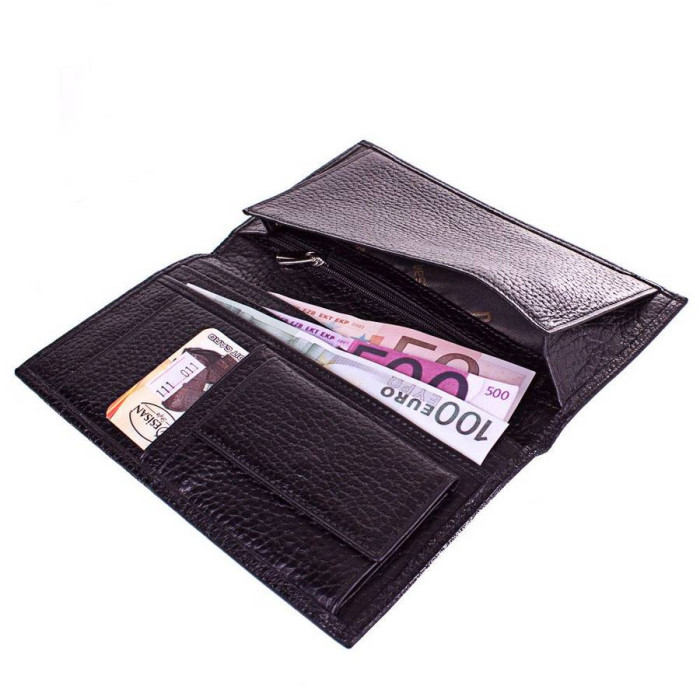 Количество основных отделений (для купюр): 1. Дополнительные отделения: 3. Отделения для визиток, банковских и дисконтных карт: 2. Отделения для мелочи: 1. Монетница закрывается при помощи клапана на механической кнопке. Прорезной карман на молнии: 1. Материал изделия: кожа флотар. Цвет: черный. Цвет фурнитуры: серебро. Размеры (X*Y*Z): 10,5 (в раскрытом виде - 21 см)*19*1 см. Аксессуар изготовлен без застежки. Изделие упаковано в фирменную картонную коробку. Страна происхождения торговой марки Desisan - Турция. Гарантия: 1 месяц.