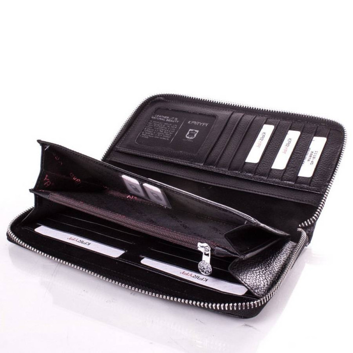 Кошелек - удобная и практичная штука, это все знают. Но не всегда и не всем необходим этакий тяжеловесный, солидный и серьезный аксессуар, к которому иначе как на «Вы» и не обратишься. Если Вам подходит более простой вариант этого аксессуара, то можете купить данный экземпляр, произведенный торговой маркой KARYA. Стильность, простота и оригинальность - вот главные достоинства этого компанейского кошелька. Без лишних деталей и нагромождения отделений с карманами и карманов с отделениями Вы получаете только отсеки для купюр, карман на «молнии», а остальное – под карточки, пропуск и даже ручку или карандаш. Натуральная кожа и качественная фурнитура дают гарантию долгой службы. Вы можете с уверенностью прийти в шоу-рум магазина "Емили" или оставить заказ на сайте – широкий выбор классных товаров, приятно низкие цены и внимательное обслуживание всегда ожидает Вас.