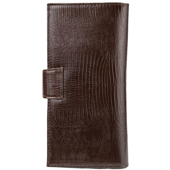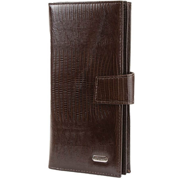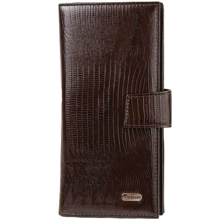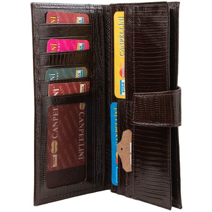 Размеры (X*Y*Z): 9 х 18,5 х 2 см. Ширина в раскрытом виде – 18,7 см. Материал изделия: кожа. Цвет: коричневый. Цвет фурнитуры: серебро. Гарантия: 1 месяц. Количество основных отделений (для купюр): 1. Дополнительные отделения: 2. Отделения для визиток, банковских и дисконтных карт: 11. Отделения с прозрачным окошком: 1. Портмоне выполнено без отделения для монет. Аксессуар закрывается при помощи хлястика на механической кнопке. Изделие упаковано в картонную коробку. Страна происхождения торговой марки Canpellini - Турция.