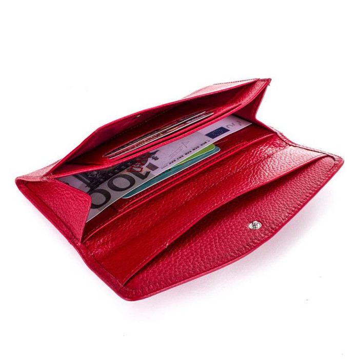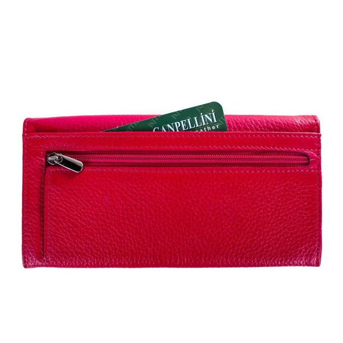 Количество основных отделений (для купюр): 2. Дополнительные отделения: 2. Отделения для визиток, банковских и дисконтных карт: 8. На тыльной стороне кошелька есть один большой накладной карман и один прорезной карман на молнии. Материал изделия: кожа. Цвет: красный. Цвет фурнитуры: серебро. Размеры (X*Y*Z): 17,8*9,2*1,7 см. Аксессуар закрывается при помощи клапана и механической кнопки. Изделие упаковано в фирменную картонную коробку. Страна происхождения торговой марки CANPELLINI - Турция. Гарантия: 1 месяц.