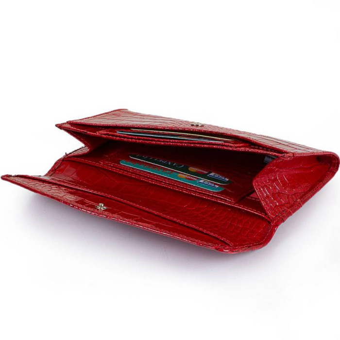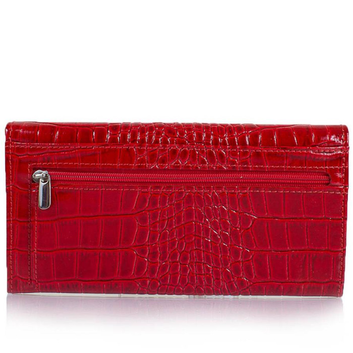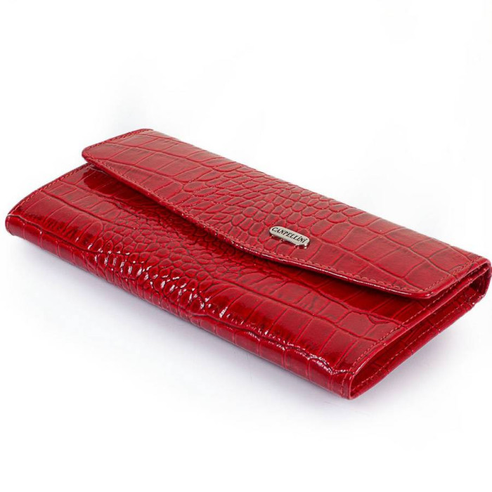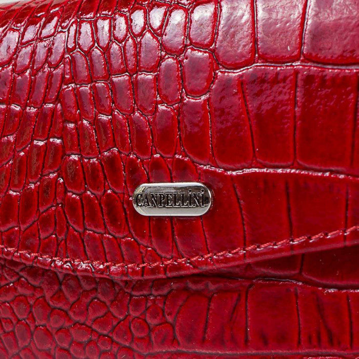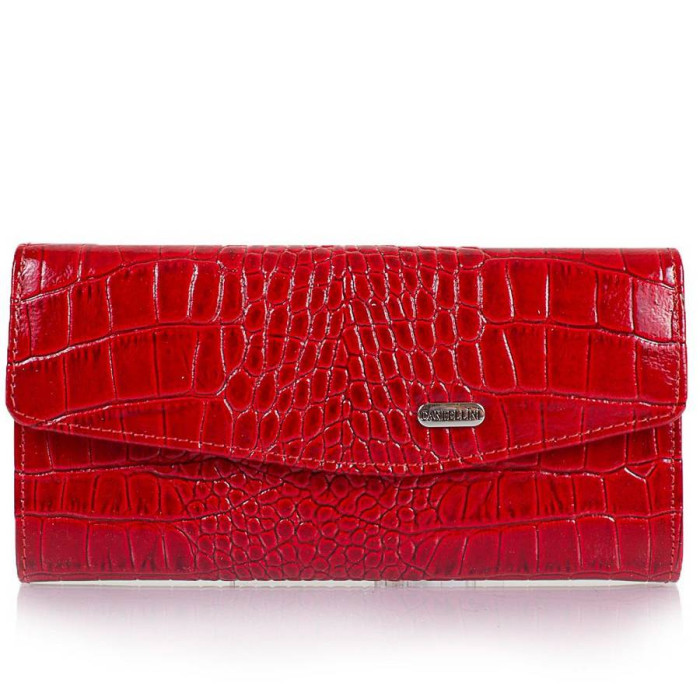 Количество основных отделений (для купюр): 2. Дополнительные отделения: 2. Отделения для визиток, банковских и дисконтных карт: 8. На тыльной стороне кошелька есть один большой накладной карман и один прорезной карман на молнии. Материал изделия: кожа под крокодила. Цвет: красный. Цвет фурнитуры: серебро. Размеры (X*Y*Z): 17,8*9,2*1,7 см. Аксессуар закрывается при помощи клапана и механической кнопки. Изделие упаковано в фирменную картонную коробку. Страна происхождения торговой марки CANPELLINI - Турция. Гарантия: 1 месяц.