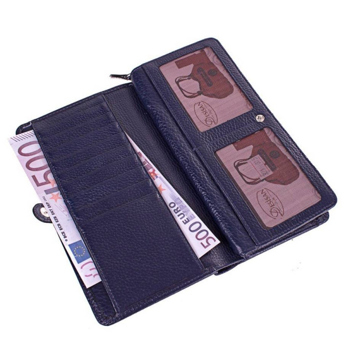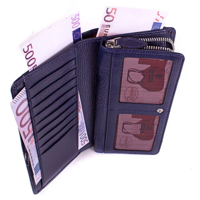Количество основных отделений (для купюр): 2 (расположены в центральной секции). Дополнительные отделения: 3 (одно находится на тыльной стороне кошелька и имеет застежку-кнопку). Отделения для документов, фотокарт и пропусков: 2 (имеют прозрачные окошки). Отделения для визиток, банковских и дисконтных карт: 15 (6 из них - на тыльной стороне кошелька). Отделения для мелочи: 1. Монетница закрывается при помощи молнии и находится в центральной секции. Материал изделия: кожа флотар. Цвет: темный синий. Цвет фурнитуры: серебро. Размеры (X*Y*Z): 20,3*10*2,5 см. Аксессуар закрывается при помощи молнии (основная центральная секция с отделениями для купюр и монетницей), а также механических кнопок (боковые секции). Изделие упаковано в фирменную картонную коробку. Страна происхождения торговой марки Desisan - Турция. Гарантия: 1 месяц.
