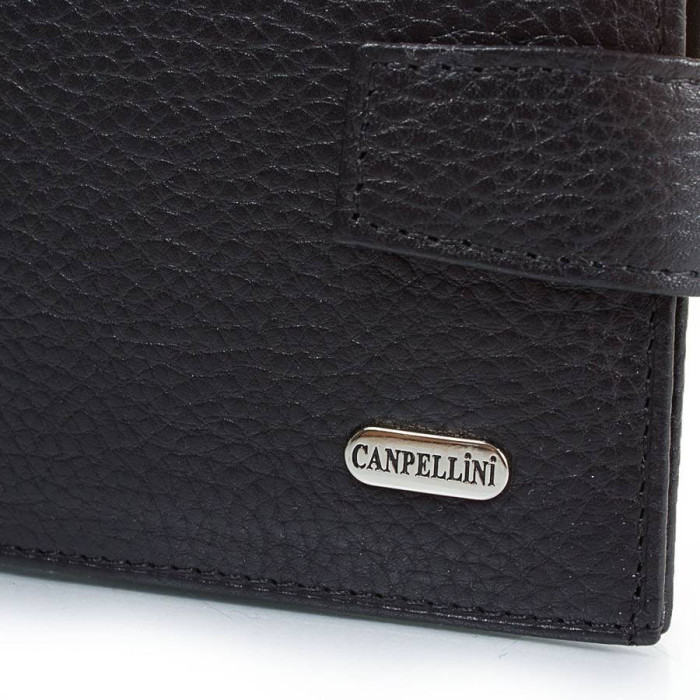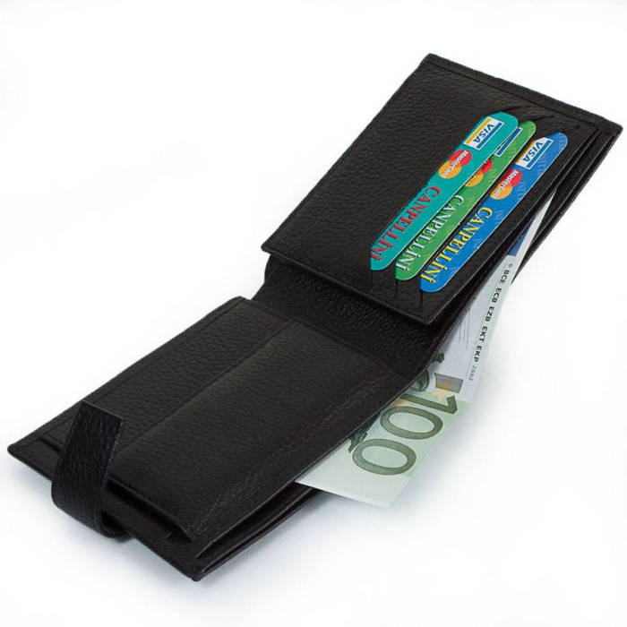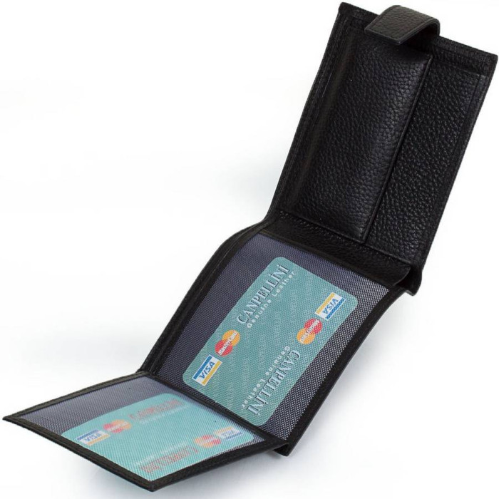Количество основных отделений (для купюр): 2. Отделения для документов, фотокарт и пропусков: 2 (имеют прозрачные окошки). Отделения для визиток, банковских и дисконтных карт: 3. Отделения для мелочи: 1. Монетница закрывается при помощи клапана на механической кнопке. Материал изделия: кожа флотар. Цвет: черный. Цвет фурнитуры: серебро. Размеры (X*Y*Z): 12,5*9,8*2,5 см. Ширина в раскрытом виде - 25,5 см. Аксессуар закрывается при помощи хлястика и механической кнопки. Изделие упаковано в фирменную картонную коробку. Страна происхождения торговой марки Canpellini - Турция. Гарантия: 1 месяц.
