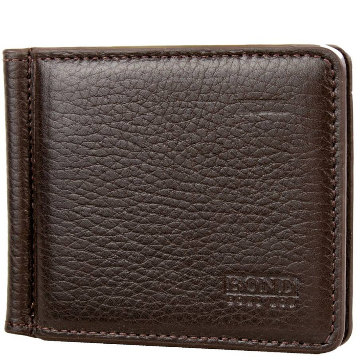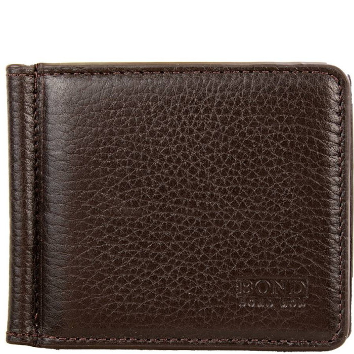 Количество основных отделений (для купюр): 1. Оно оснащено мощным металлическим зажимом. Материал изделия: кожа. Цвет: коричневый. Цвет фурнитуры: серебро. Размеры (X*Y*Z): 10*8*0,5 см. Ширина в раскрытом виде: 18 см. Аксессуар закрывается при помощи магнитной застежки. Изделие упаковано в картонную коробку. Страна происхождения ТМ BOND - Турция. Гарантия: 1 месяц.