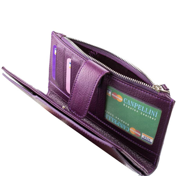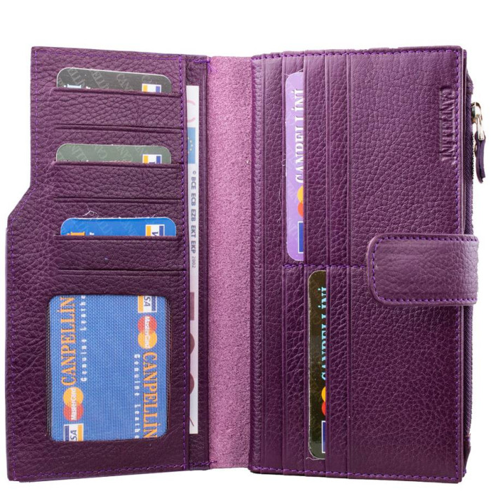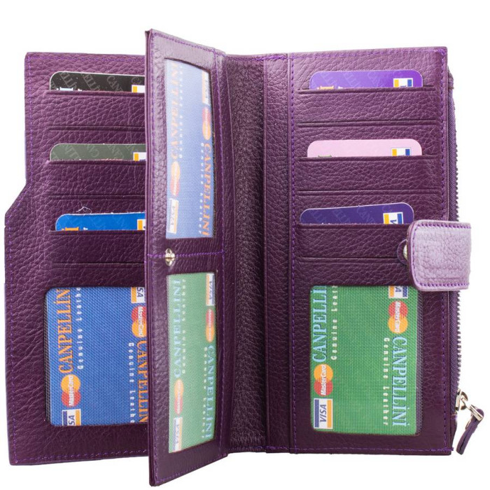 Количество основных отделений (для купюр): 4 (расположены в разных секциях). Дополнительные отделения: 2 (суммарное количество). Отделения для документов, фотокарт и пропусков: 4 (имеют прозрачные окошки). Отделения для визиток, банковских и дисконтных карт: 18. Отделения для мелочи: 1. Монетница закрывается при помощи молнии. Материал изделия: кожа. Цвет изделия: фиолетовый. Цвет фурнитуры: серебро. Размеры (X*Y*Z): 10*18*1,5 см. Аксессуар закрывается при помощи механической кнопки. Изделие упаковано в фирменную картонную коробку. Страна происхождения торговой марки Canpellini - Турция. Гарантия: 1 месяц.