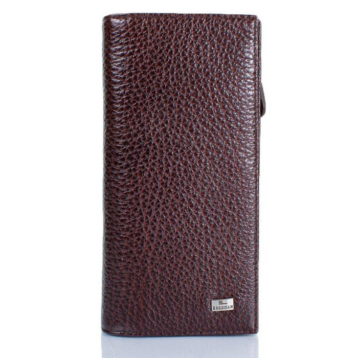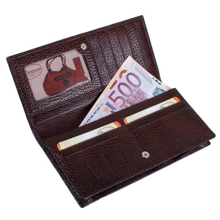 Количество основных отделений (для купюр): 1. Дополнительные отделения: 2. Отделения для SIM-карт: 2. Отделения для визиток, банковских и дисконтных карт: 11. Отделения для фотокарточек, пропусков, проездных билетов и прочих документов: 1 (имеет прозрачное окошко). Карман-монетница закрывается застежкой-молнией с кожаным брелком. Материал изделия: кожа флотар. Цвет:темно-коричневый. Цвет фурнитуры: серебро. Размеры (X*Y*Z): 17,8*9,2*1,7 см. Аксессуар закрывается с помощью механической кнопки. Изделие упаковано в фирменную картонную коробку. Страна происхождения торговой марки Desisan - Турция. Гарантия: 1 месяц.