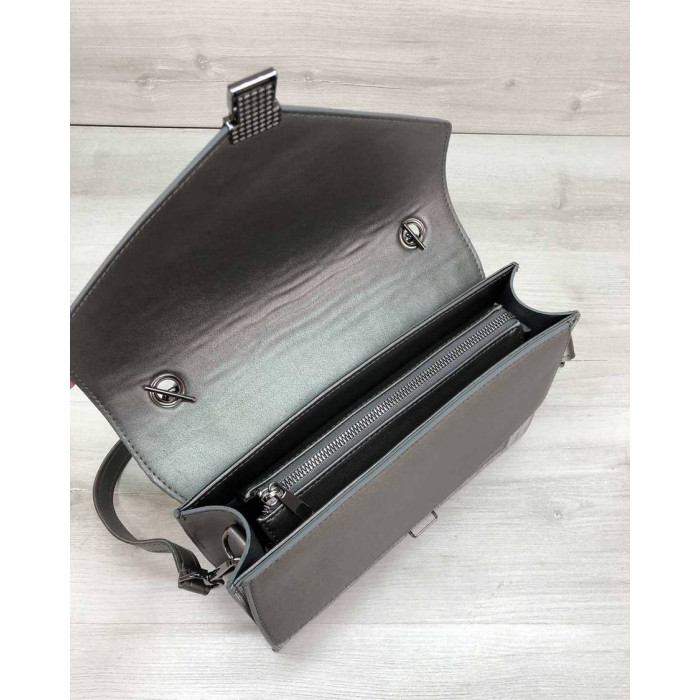 Сумка имеет одно отделение, которое открывается при помощи молнии. Крышка открывается при помощи защелки. Внутри сумка имеет два кармана: открытый и на молнии.