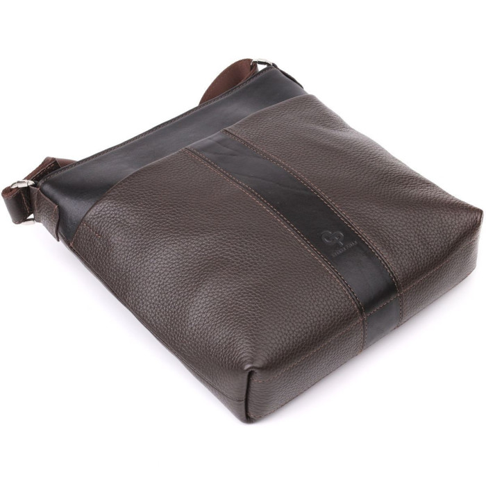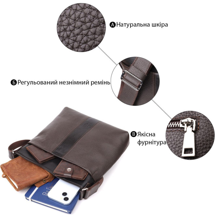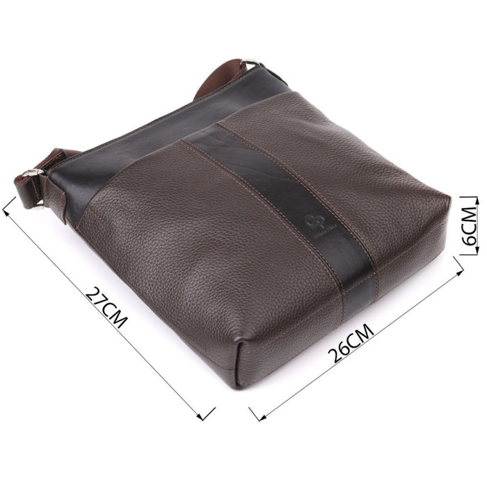 Удобная и стильная сумка, выполненная из натуральной кожи высокого качества. Универсальный черный цвет делает аксессуар уместным как в деловом, так и в повседневном образе. Интересная особенность модели — сочетание двух фактур кожи: гладкой и зернистой, что придаёт изделию выразительности и подчеркивает индивидуальность владельца. Сумка отличается прочностью, надёжностью и долговечностью, а благодаря продуманному дизайну в нее легко помещаются все необходимые вещи. Это отличное решение для активных и современных людей, которые ценят комфорт, качество и стиль. Поставляется в оригинальном фирменном чехле, что делает её не только удобным аксессуаром, но и достойным подарком.