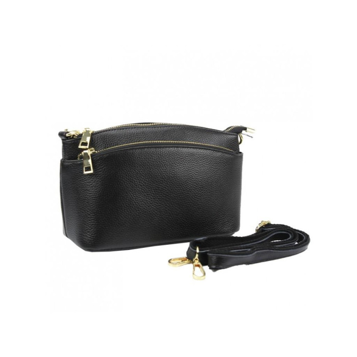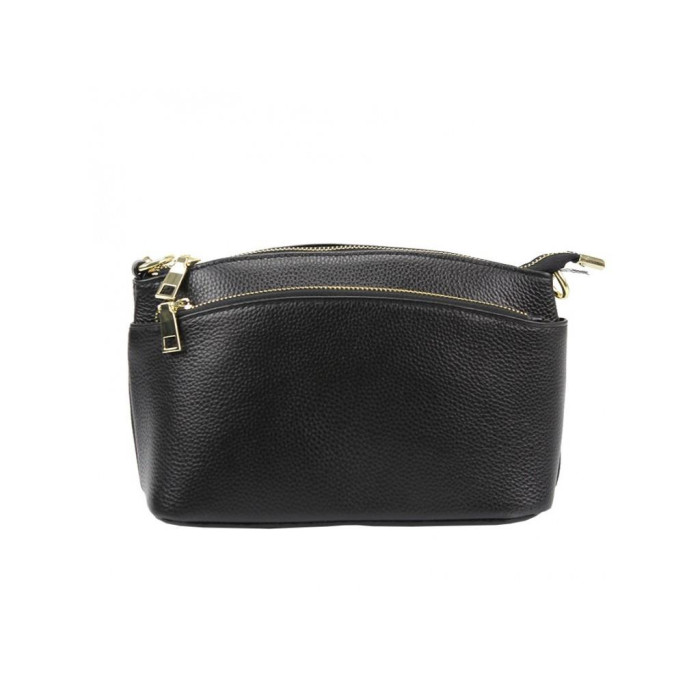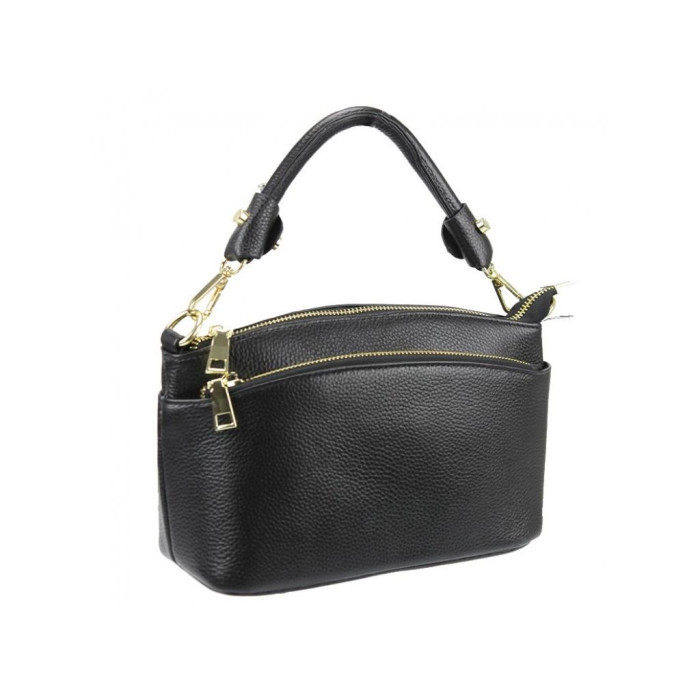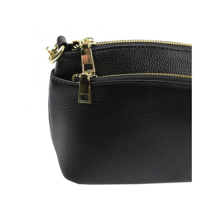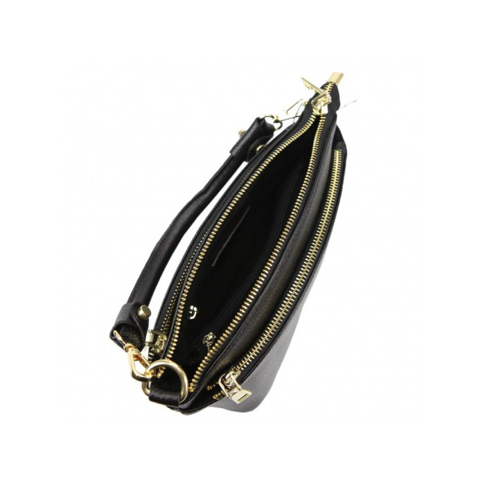 Черная маленькая женская сумка с золотой фурнитурой снабжена внутренним карманом на молнии. С обеих сторон есть дополнительные карманы на молниях.