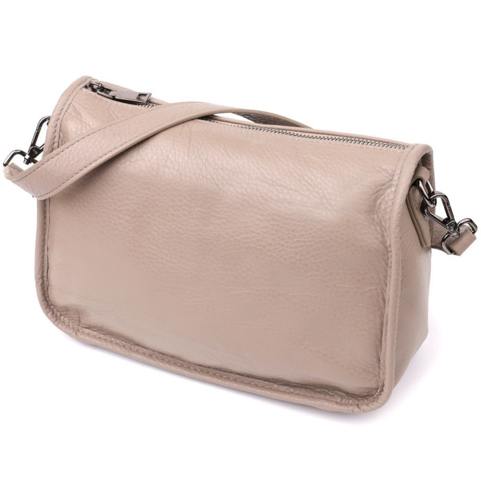 Фурнитура цвета серебра подчёркивает холодный тон кожи, создавая аккуратный и стильный контраст. В комплект входят два съёмных ремешка — кожаный и текстильный, позволяющие носить сумку в разных вариантах: на плече, через плечо или в руке.