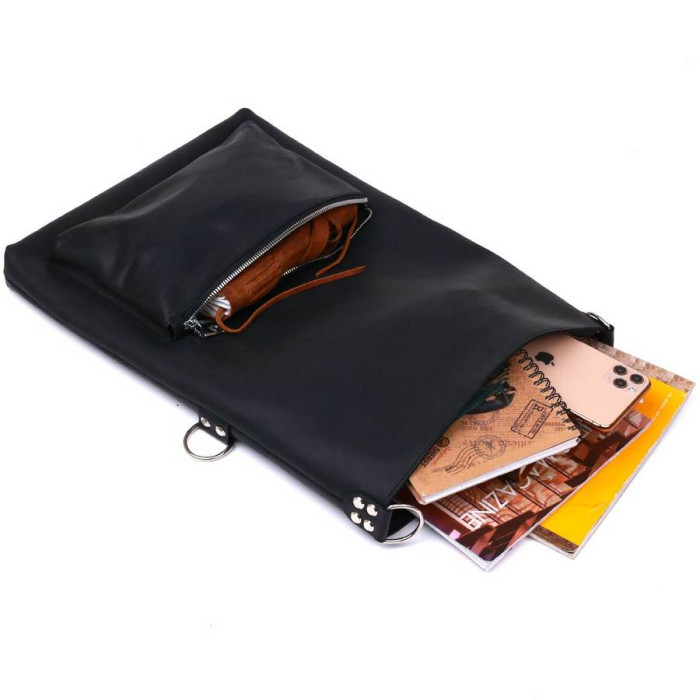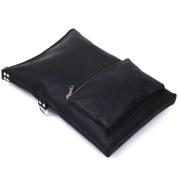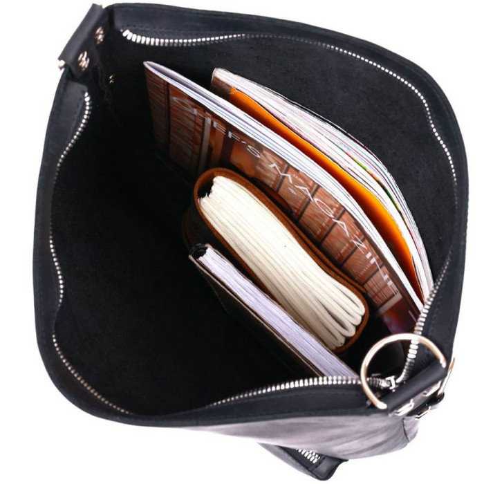 Женская сумка в интересном небанальном дизайне от украинского производителя. Материал изготовления – натуральная кожа с отличными показателями прочности и устойчивости к различного рода износу. Цвет сумки – универсальный черный, фактура – матовая гладкая. Внутреннее отделение очень просторное и вместительное, на внешней стороне есть накладной небольшой карман.