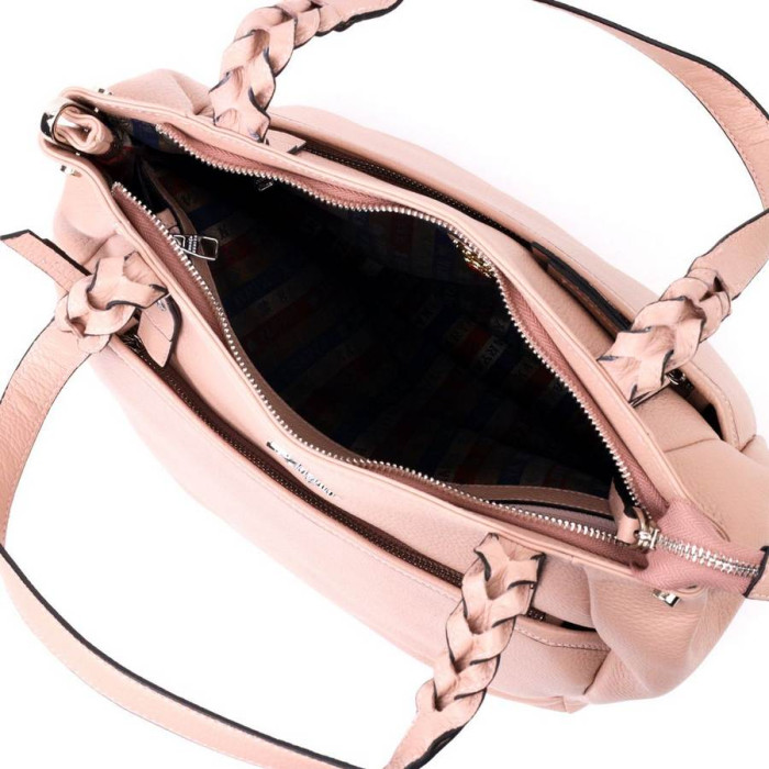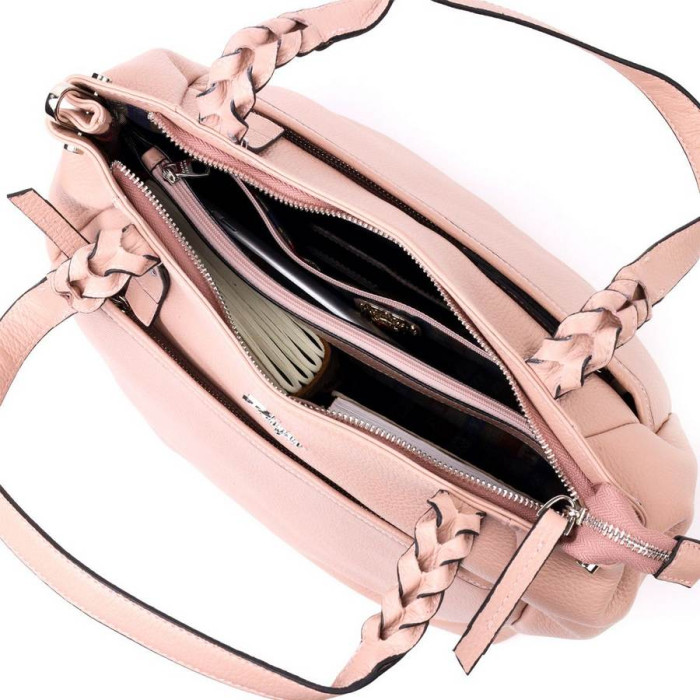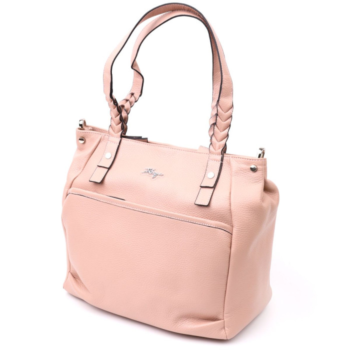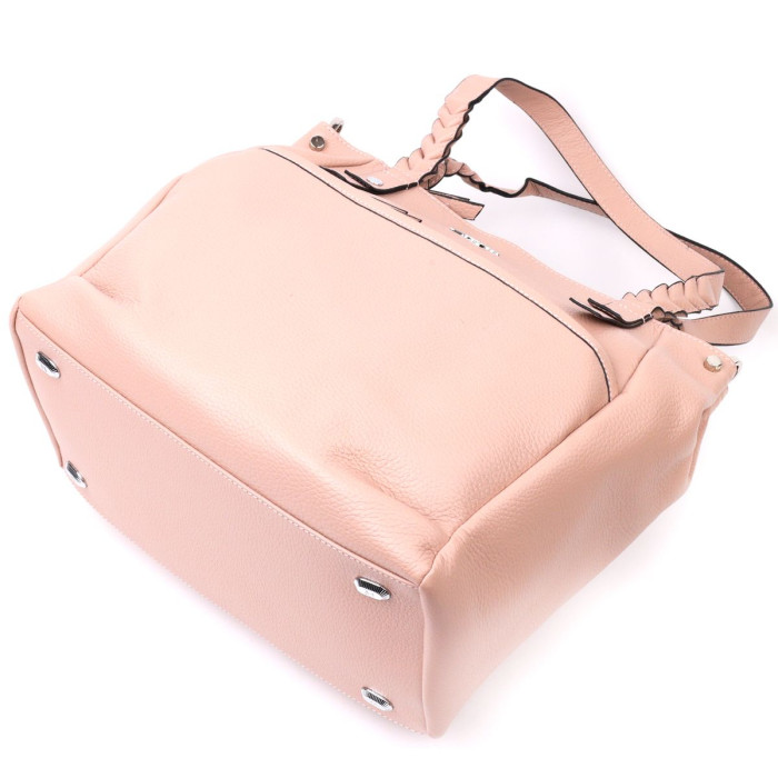 Сверхпрочная женская сумка-шоппер из мелкозернистой натуральной кожи, в нежном пудровом цвете. Сумка функциональна и прочная, отличный вариант для ежедневного пользования. В изделии использована качественная фурнитура серебристого цвета, которая не только дополняет стильный дизайн сумки, но и защищает изделие. Шоппер имеет прочную подкладку. Аксессуар упакован в фирменный текстильный мешок Karya. Сумка из натуральной кожи всегда будет отличным подарком любой женщине.