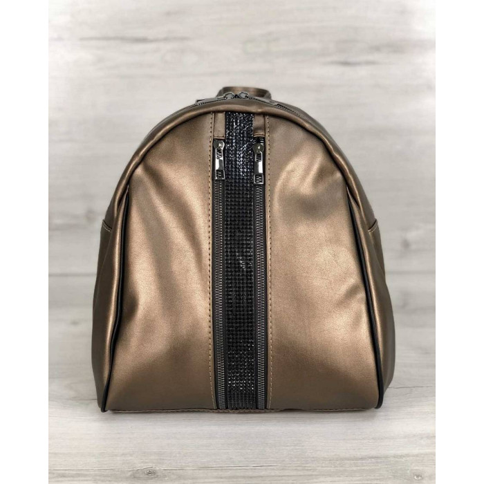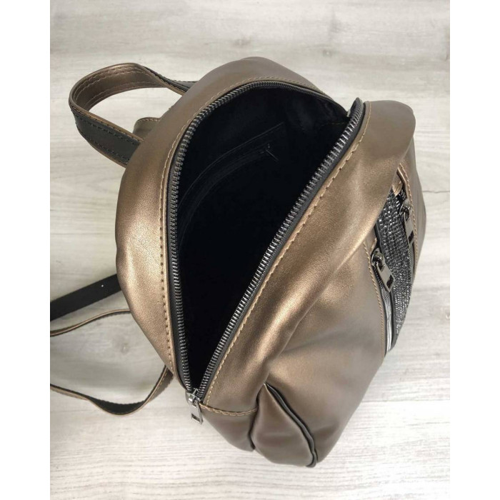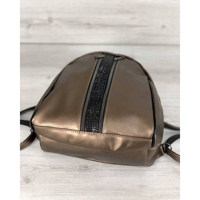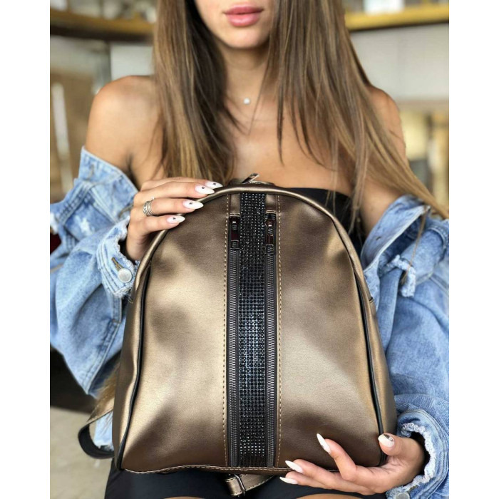 Рюкзак украшен полоской из черных камней, которые переливаются на свету.