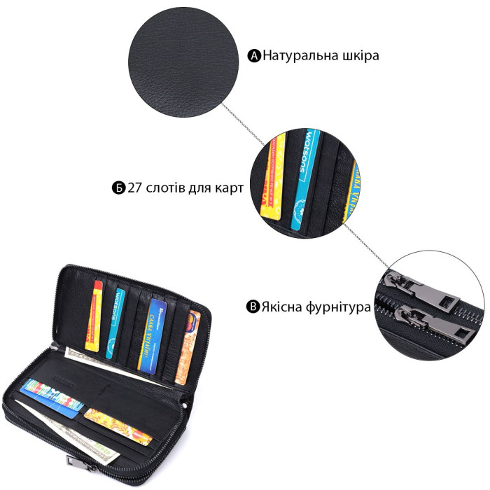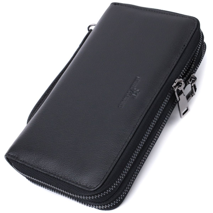 Удобный мужской клатч в классическом стиле из натуральной кожи. Для максимальной удобности кошелек разделен на два больших отделения, что закрываются на молнии. Аксессуар имеет все необходимое, чтобы стать Вам незаменимым помощником в повседневной жизни. Вы с легкостью поместите в него бумажные купюры, монеты, документы, карточки и даже смартфон. На лицевой стороне, вверху посередине расположено тиснение с логотипом производителя, что является залогом качества изделия. Упакован аксессуар в белую плотную картонную коробку с фирменным логотипом.