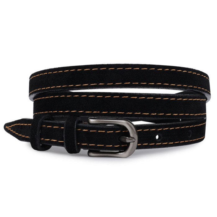 Превосходный женский ремень из замши в универсальном черном цвете, что позволяет носить его под любой стиль одежды и обуви. Материал изготовления – натуральная высококлассная кожа с высокими показателями прочности. Пряжка небольшого размера и имеет лаконичный простой дизайн, фактура изделия очень приятная на ощупь
