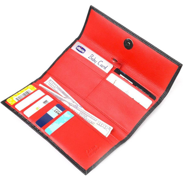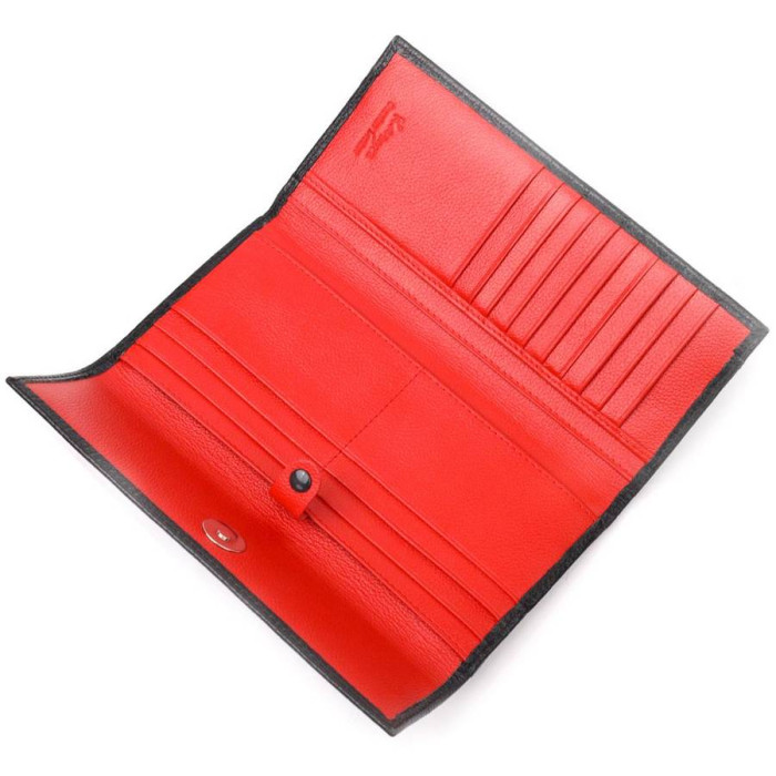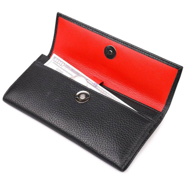 Функциональный женский кошелек из натуральной качественной кожи, в комбинации из двух цветов, снаружи – черный, внутри – красный. Складывается аксессуар пополам и закрывается клапаном на магнит. Особенностю данного аксессуара есть наличие блока для кредитных карточек, что закрывается хлястиком на кнопку. Такой кошелек из натуральной кожи - это идеальный вариант на каждый день для тех, кто ценит качество, удобство и комфорт, а также будет отлично дополнять Ваш повседневный образ.