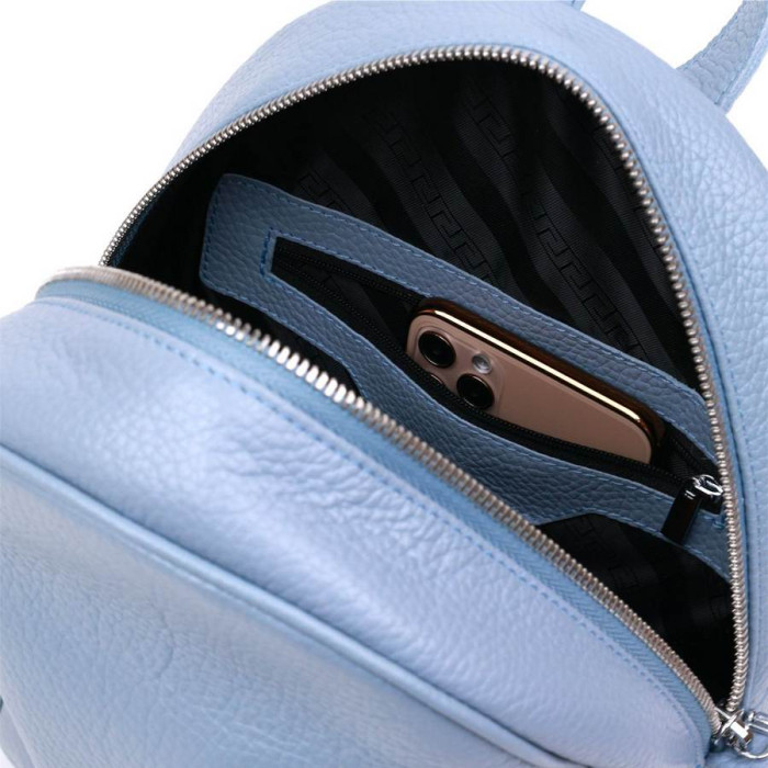 Замечательный женский рюкзак небольшого размера в практичном и стильном дизайне. Материал изготовления – натуральная кожа высокого качества с повышенной прочностью и стойкостью к износу. Цвет данной модели – бледно-голубой, что смотрится очень красиво и не вызывающе. Фактура – зернистая и очень приятная на ощупь. Шлейки и ручка для переноски выполнены также из натуральной кожи.