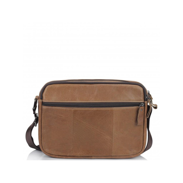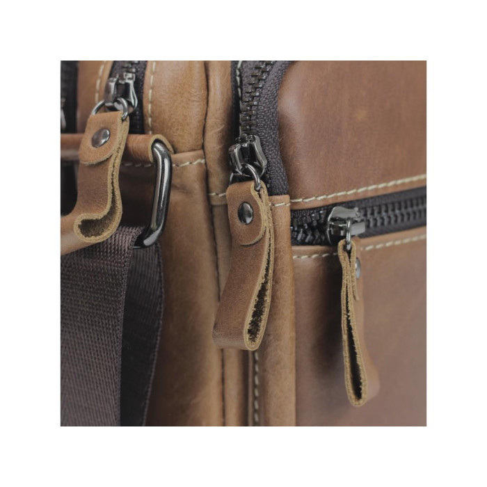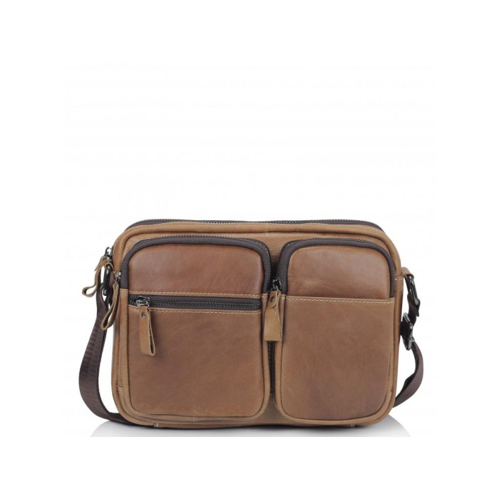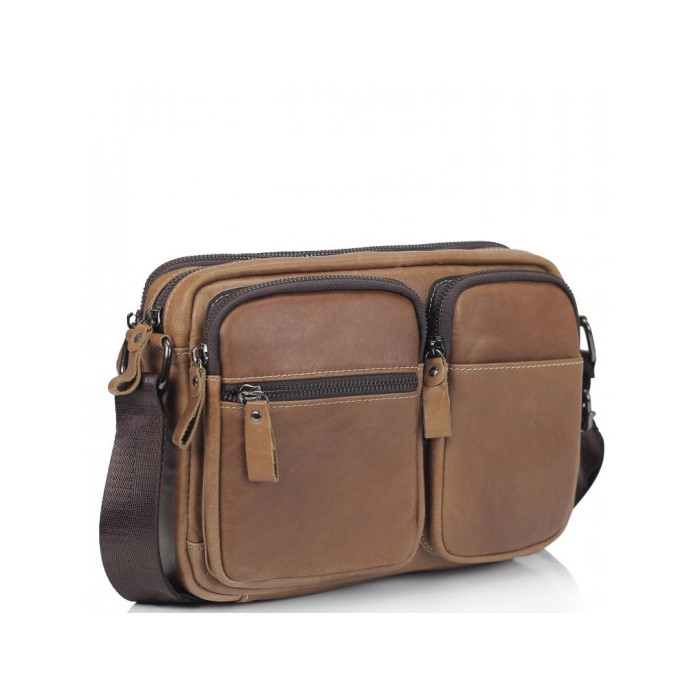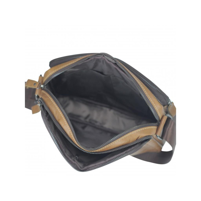 Коричневая горизонтальная сумка через плечо выполнена с натуральной кожи гладкой структуры. Текстильный ремень регулируется по длине, фурнитура темно-серебряного цвета, пуллера кожаные. Внутри сумки - два основных отделения, карман на замке и карман открытого типа. С лицевой стороны сумки - два накладных кармана с замком, на одном накладном кармане сверху есть дополнительный карман открытого типа, на втором - еще один карман на замке, с тыльной - один карман на замке.