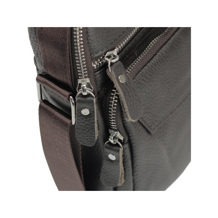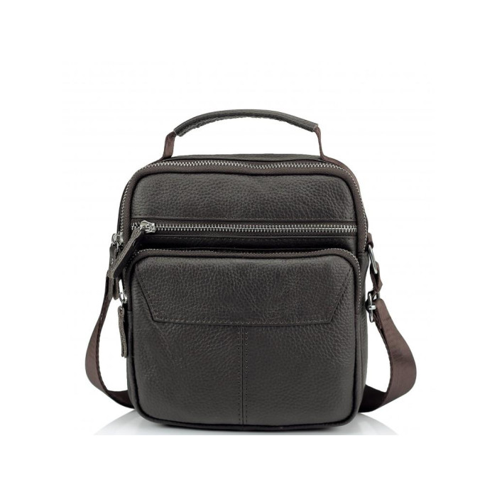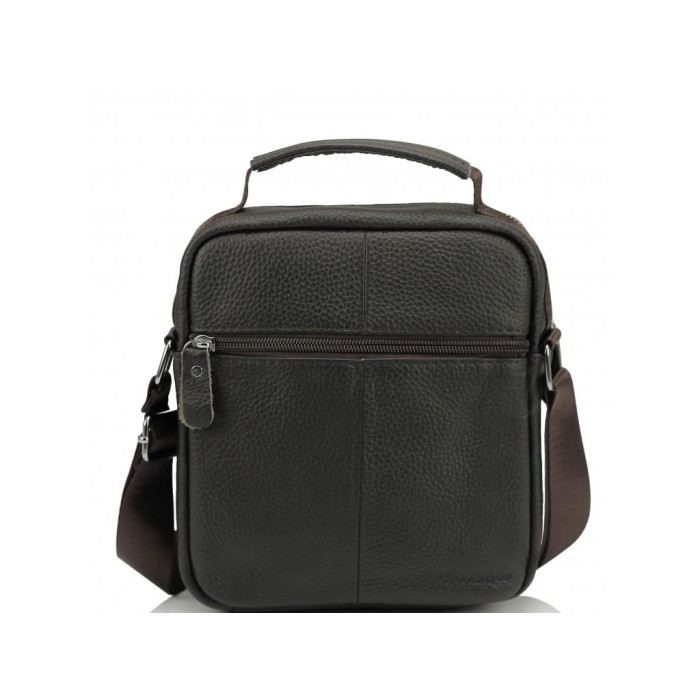 Представленная кожаная сумка для мужчин имеет небольшой, компактный размер. Она сделана с натуральной кожи и имеет зернистую структуру. Мужскую сумку можно носить как в руке, так и через плечо. Для носки через плечо сумка оснащена текстильным ремешком, который регулируется по длине. Сумка через плечо имеет одно основное отделение. На лицевой стороне есть два дополнительных кармана на молнии, один из них накладной. С тыльной стороны также есть горизонтальный карман. Внутри сумки один карман для мелочей.