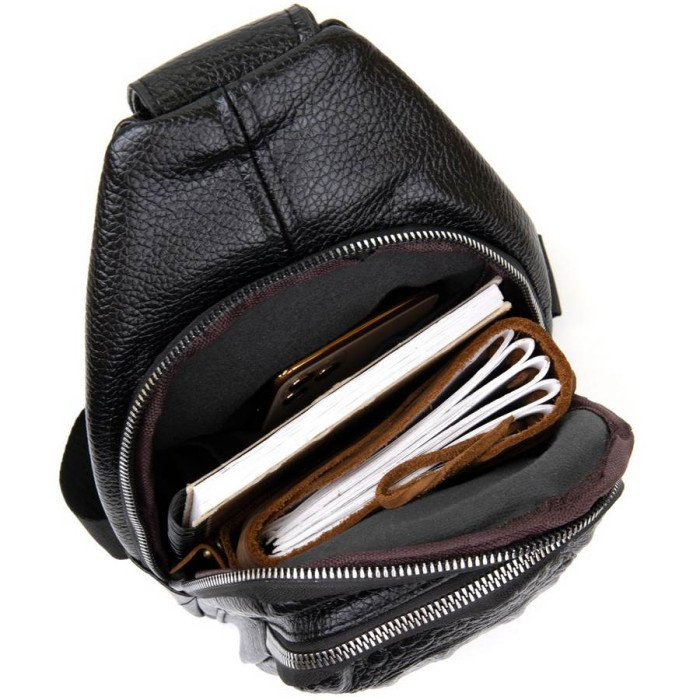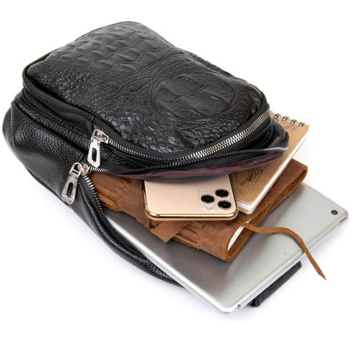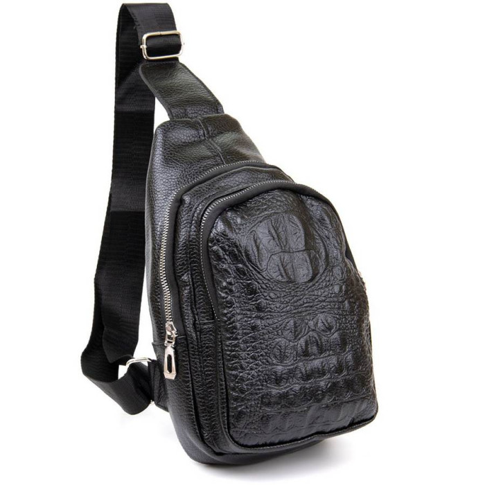Компактная сумка через плечо из кожзама с тиснением под кожу крокодила на лицевой стороне. Дополнен аксессуар крепкой серебристой фурнитурой. Сумка очень популярна среди водителей, путешественников и практичных мужчин. Особенностью данной сумки является то, что ее удобно брать с собой в дорогу. Сумка носится через плечо таким образом ваши руки будут свободны. Изделие в черном цвете с текстильной подкладкой и открытым карманом внутри сумки. Сумка кросс подойдет для вас, если вы являетесь поклонником удобных сумок, которые не отягощают ваши руки.