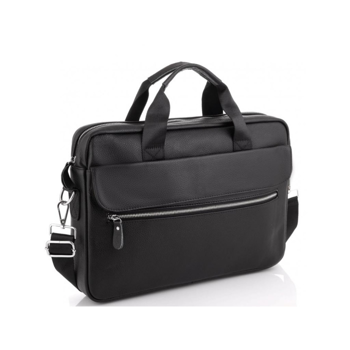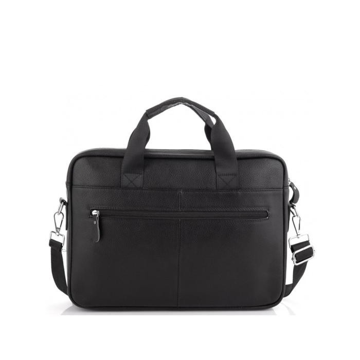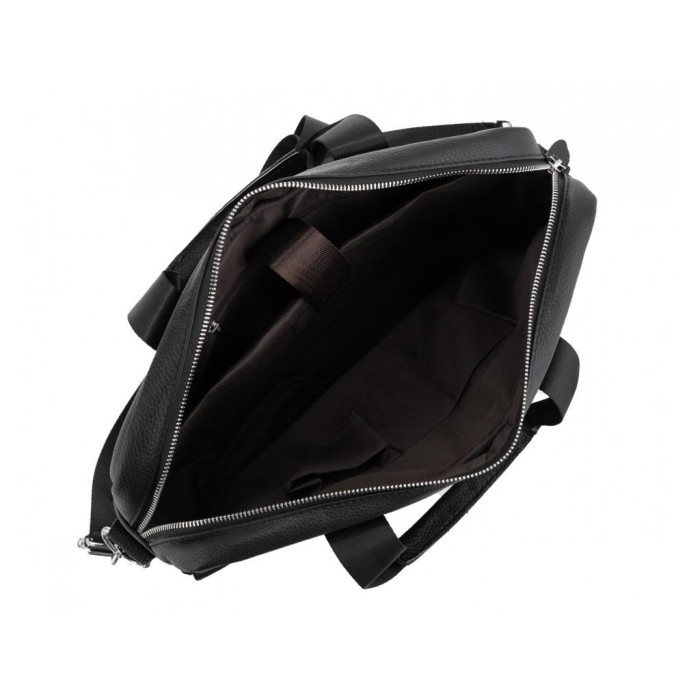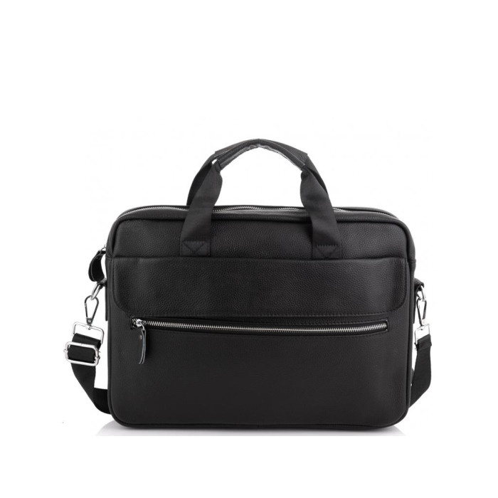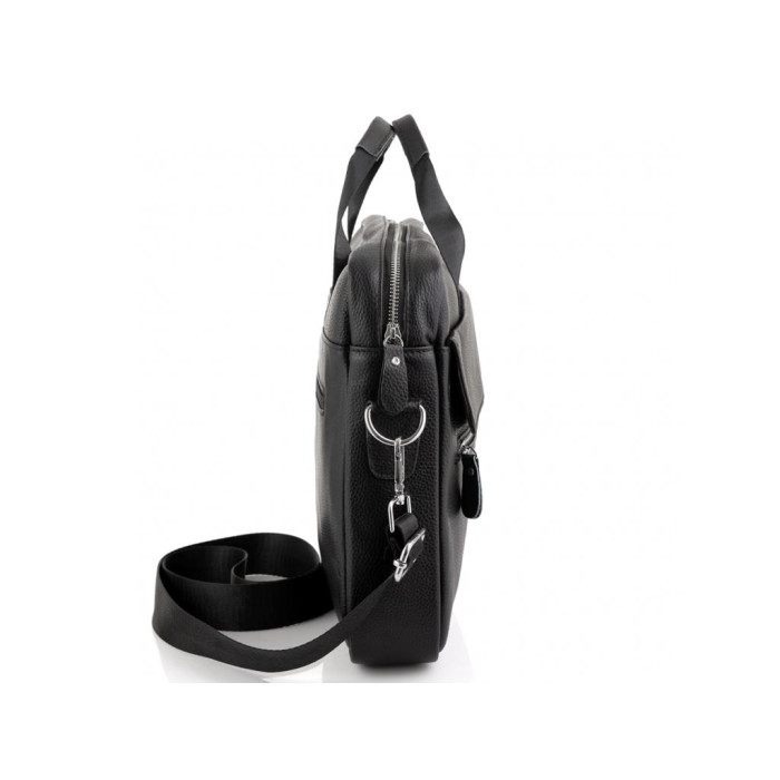 Черная кожаная сумка для ноутбука. Подойдет для ноутбуков на 14 дюймов. Сумка для мужчин имеет зернистую структуру. Для носки есть ручки с кожаной вставкой и наплечный ремень. Одно основное отделение на молнии. С лицевой стороны карман с клапаном на магнитах и карман на молнии. С тыльной стороны карман на молнии. Внутри сумки карман для ноутбука на липучке, карман на молнии и два кармана открытого типа.