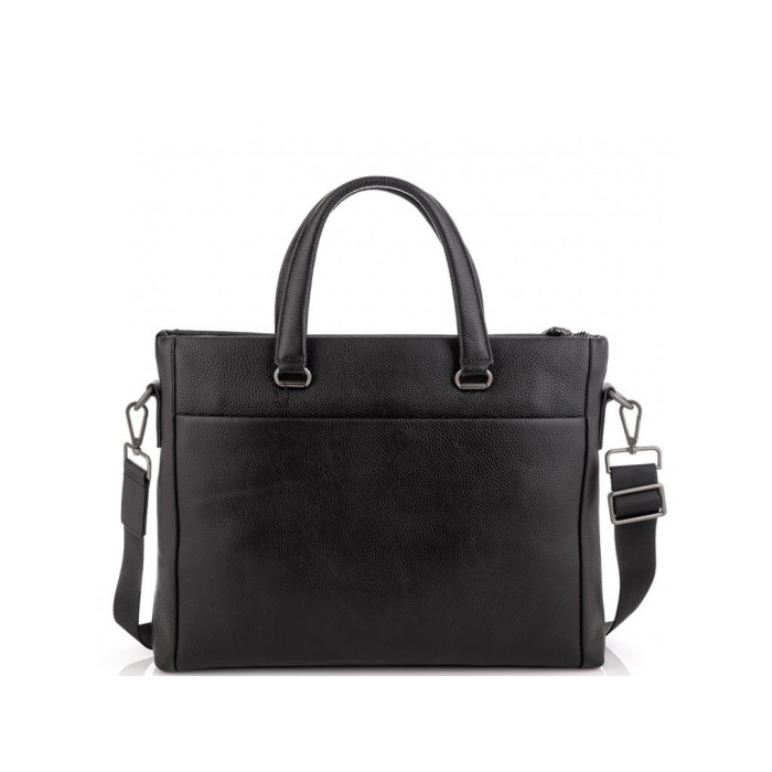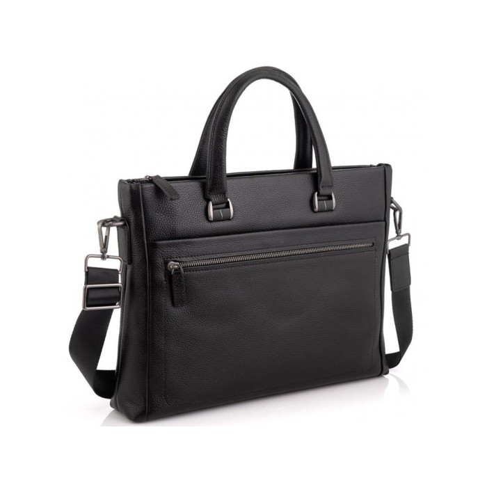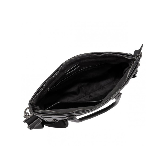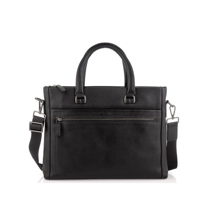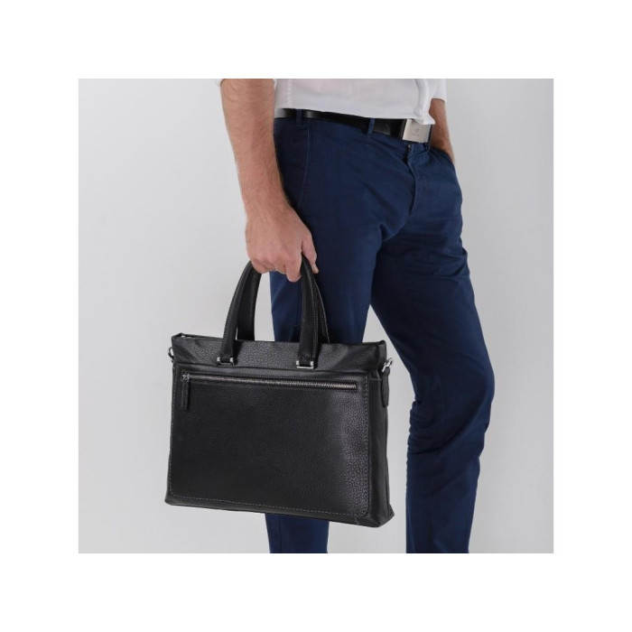 Черная кожаная сумка в зернистой коже. Пуллера в сумки кожаные. Для носки предусмотрен ремень текстильный и кожаные ручки. Есть одно основное отделение на молнии, внутри которого есть карман для гаджета, также карман на молнии и карманы открытого типа для мелочей. С лицевой стороны есть карман на магнитной кнопке и карман на молнии, с тыльной стороны карман на магнитной кнопке.