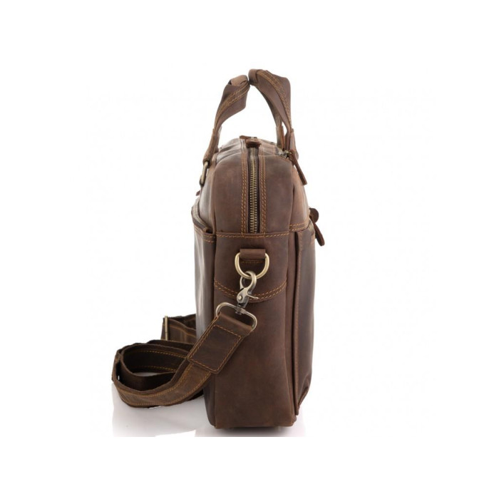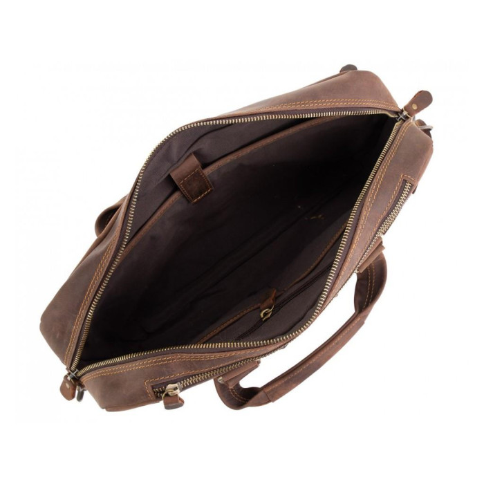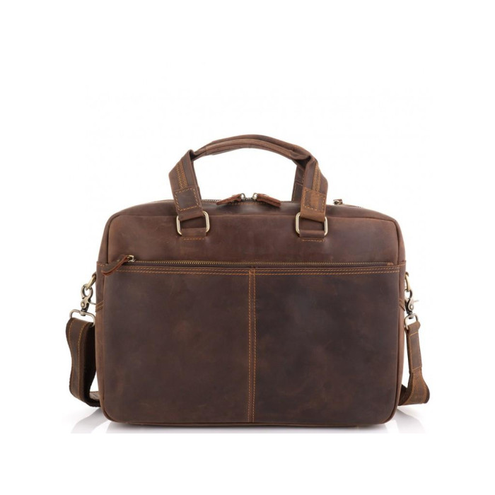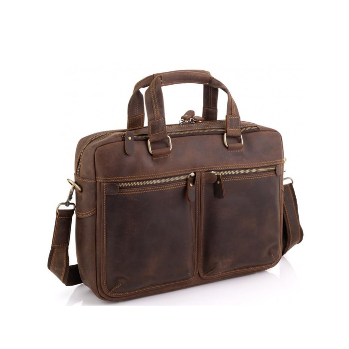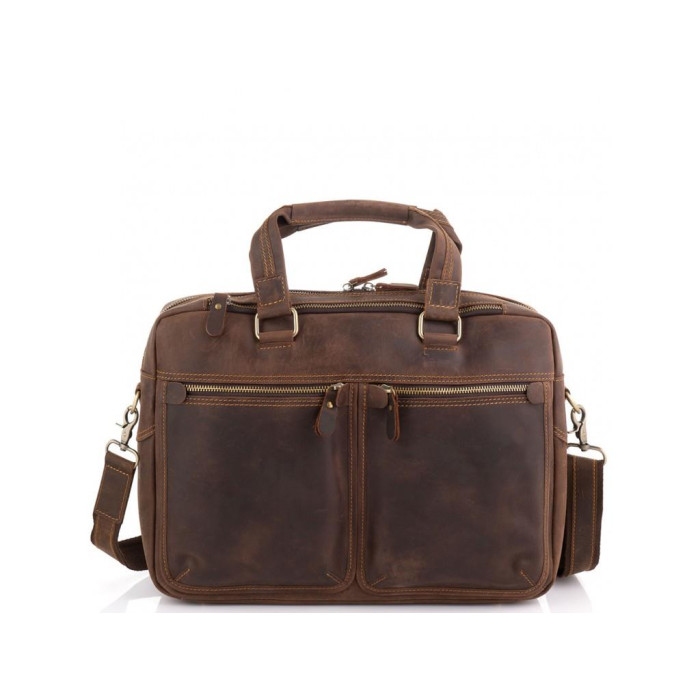 Мужская деловая сумка для ноутбука и документов из лошадиной кожи с винтажной поверхностью. Подойдет для ноутбуков 14 и 15 дюймов. Снизу сумки есть 5 металлических ножек, для носки можно использовать как кожаные ручки, так и плечевой ремень. Фурнитура - золотая, пуллера - кожаные. Сумка мужская имеет одно основное отделение. С лицевой стороны есть два небольших кармана на молнии, а также карман сверху на молнии горизонтального типа, с тыльной стороны расположен карман на молнии. Внутри сумки есть маленькие карманы открытого типа, карман на молнии, а также карман на липучке для гаджета.