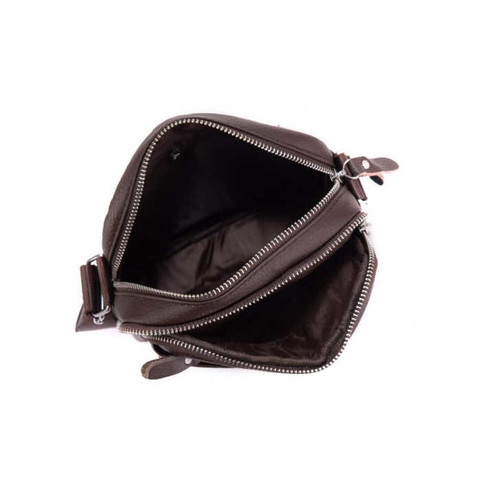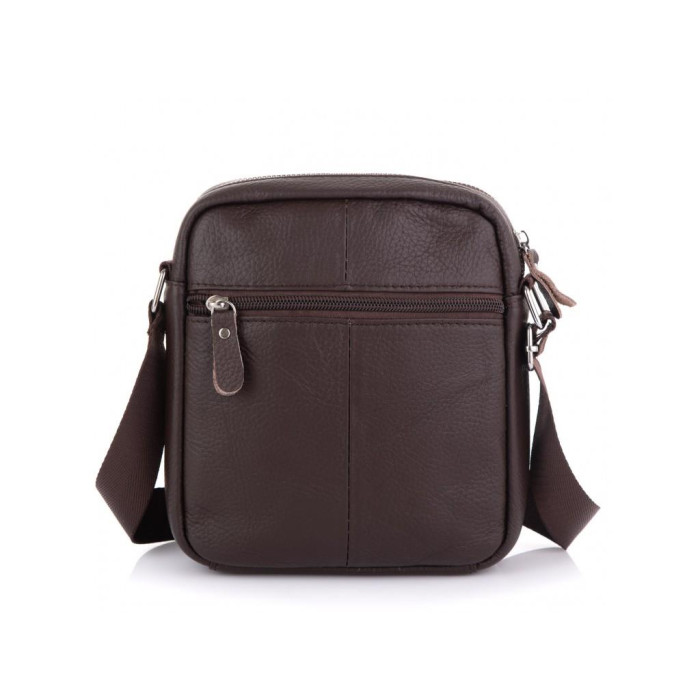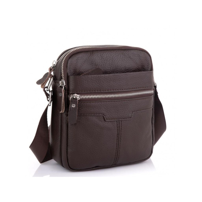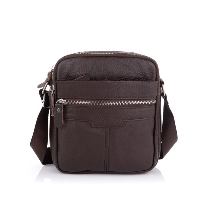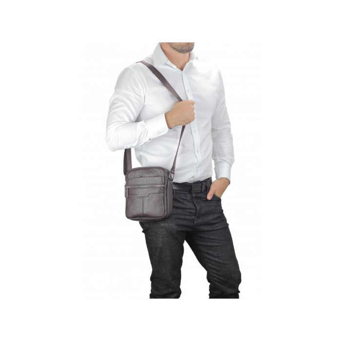 Коричневая кожаная сумка для мужчин имеет стильный и компактный дизайн. Это идеальный вариант для тех, кто любит маленькие сумки через плечо. Дизайн сумки выполнен в классическом стиле. Внутри сумки качественная текстильная подкладка. Для носки есть текстильный ремешок на плечо, несъемный. Мужская сумка включает в себя два основных отделения на молнии. Два кармана на молнии на лицевой стороне и один карман с тыльной стороны. Внутри сумки есть маленький карман для мелочей.