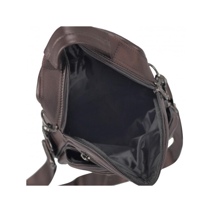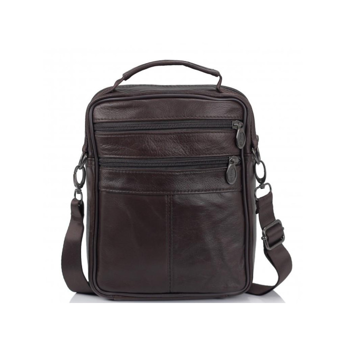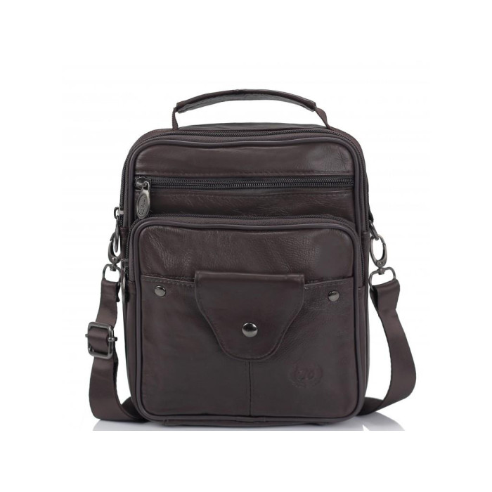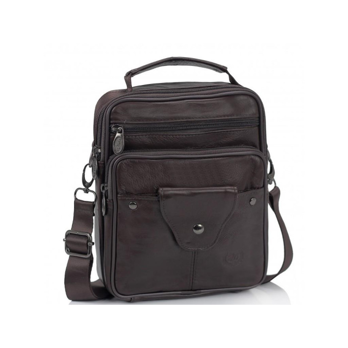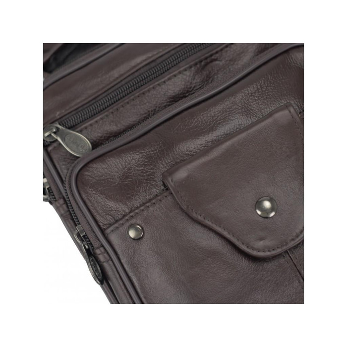 Кожаный мессенджер коричневый. Сумка имеет металлические пуллера, текстильный плечевой ремень, а также кожаную ручку для переноски в руке. Мужская сумка имеет одно основное отделение. С лицевой стороны два кармана на молнии, а также карман открытого типа на магнитной кнопке. С тыльной стороны два кармана на молнии. Внутри сумки карман на молнии для мелочей.
