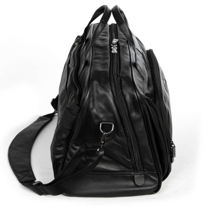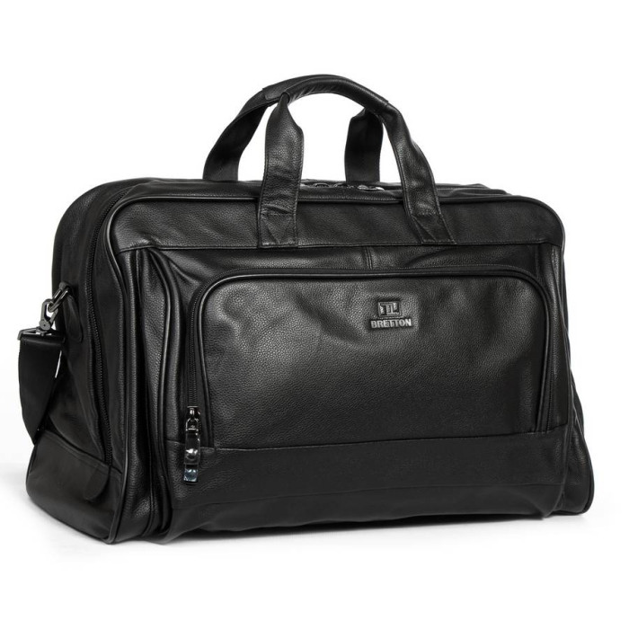Мужская кожаная дорожная сумка Bretton. Закрывается на молнию. Внутри находится одно отделение, большой боковой карман на молнии и открытый карман. На фасаде и обратной стороне расположены большие карманы на молнии. На обратной сторне сумки также есть крепеж на ручку чемодана. В комплекте регулируемый плечевой ремень с широкой мягкой вставкой.