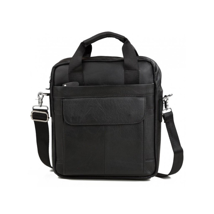 Мессенджер в черном цвете. Мужская сумка на плечо предусматривает два варианта носки - в руках, благодаря эргономичным кожаным ручкам и на плече. Текстильная плечевая шлейка регулируется по высоте и крепится на надежные металлические карабины. Сумка имеет одно основное отделение на молнии. С лицевой стороны предусмотрены два кармана, с тыльной стороны один карман на молнии. Внутри основного отсека подкладка из плотного текстиля, один карман на молнии и два кармана открытого типа.