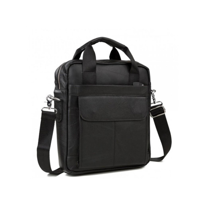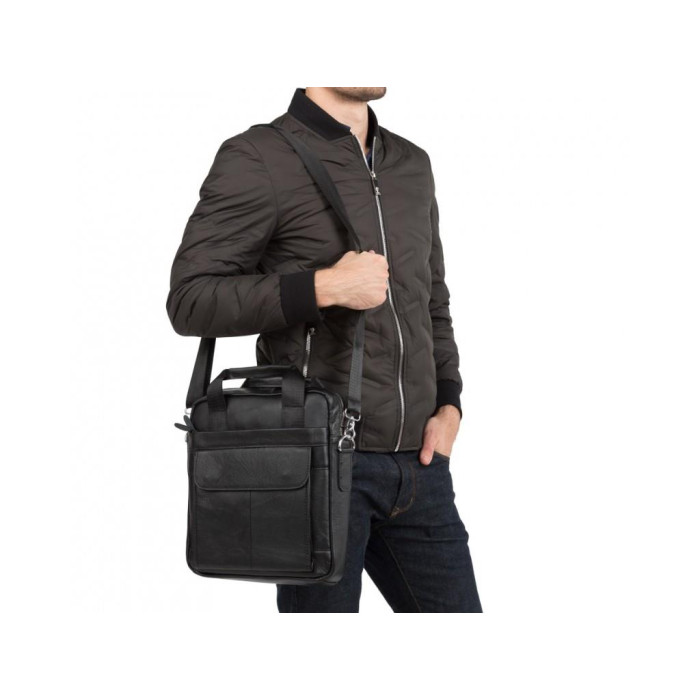Мессенджер в черном цвете. Мужская сумка на плечо предусматривает два варианта носки - в руках, благодаря эргономичным кожаным ручкам и на плече. Текстильная плечевая шлейка регулируется по высоте и крепится на надежные металлические карабины. Сумка имеет одно основное отделение на молнии. С лицевой стороны предусмотрены два кармана, с тыльной стороны один карман на молнии. Внутри основного отсека подкладка из плотного текстиля, один карман на молнии и два кармана открытого типа.