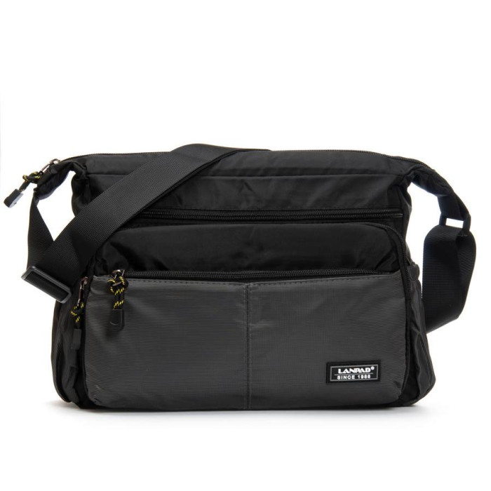 Мужская сумка Lanpad. Закрывается на молнию. Внутри находится двойное отделение, разделенное карманом-перегородкой на молнии, карман на молнии и открытый двойной карман. На фасаде и обратной стороне находятся вместительные карманы на молнии. На торцах сумки также расположены открытые карманы. Регулируемый плечевой ремень, шириной 4см.