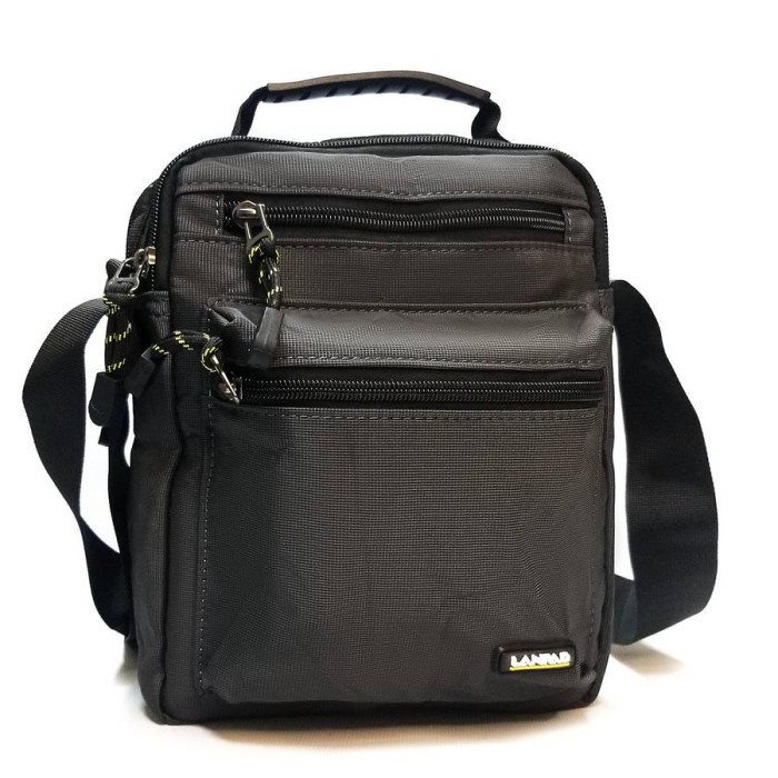Мужская большая сумка Lanpad. Два отделения, закрываются на молнию. Внутри есть карман на молнии и открытый карман. На фасаде сумки находятся 2 больших карман на молнии и на обратной стороне есть один карман на молнии. Регулируемый плечевой ремень шириной 4см.