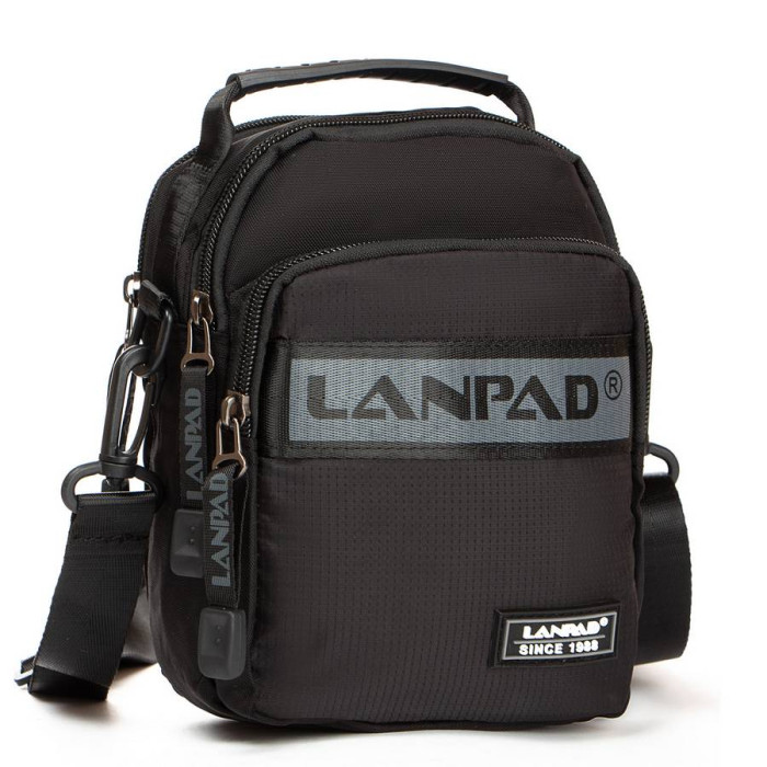 Мужская сумка Lanpad. Два отделения, закрываются на молнию. Внутри отделения есть карман на молнии и открытый карман. На фасаде находится карман на молнии. На обратной стороне есть крепление для ношения сумки на поясе.