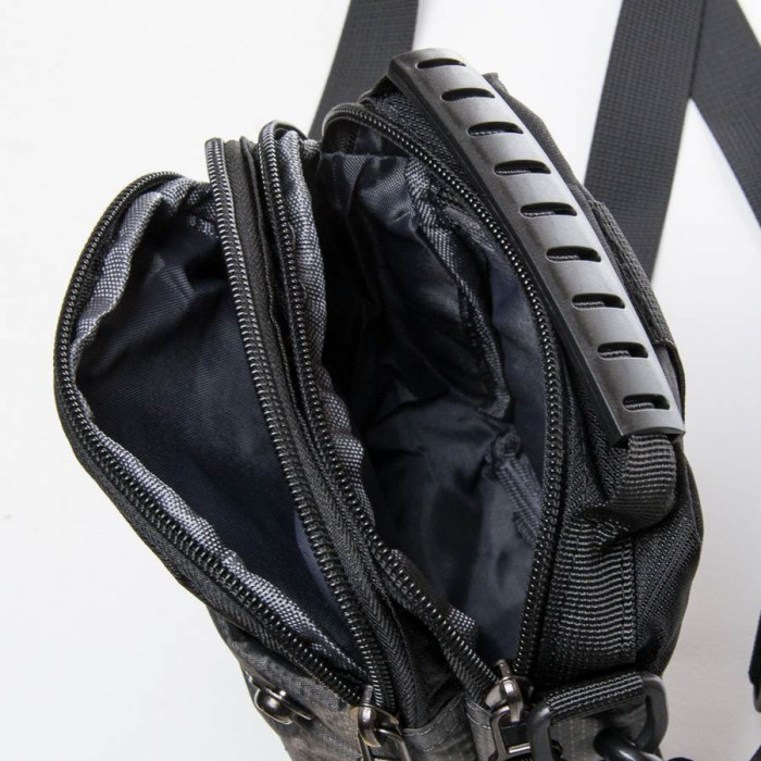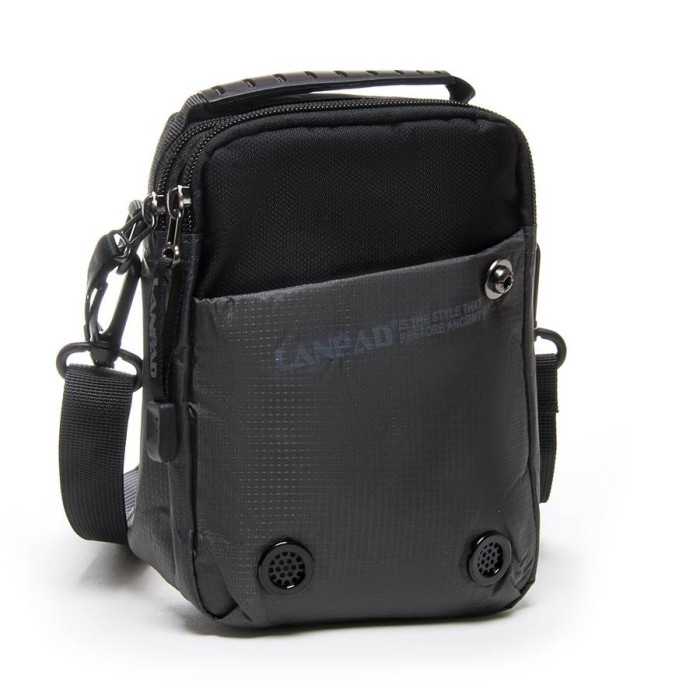 Мужская сумка Lanpad. Два отделения, закрываются на молнию. Внутри отделений есть карман на молнии и открытый карман. На фасаде расположен кармана на застежке-липучке. На обратной стороне есть крепление на пояс. К комплекте регулируемый плечевой ремень.