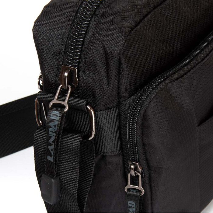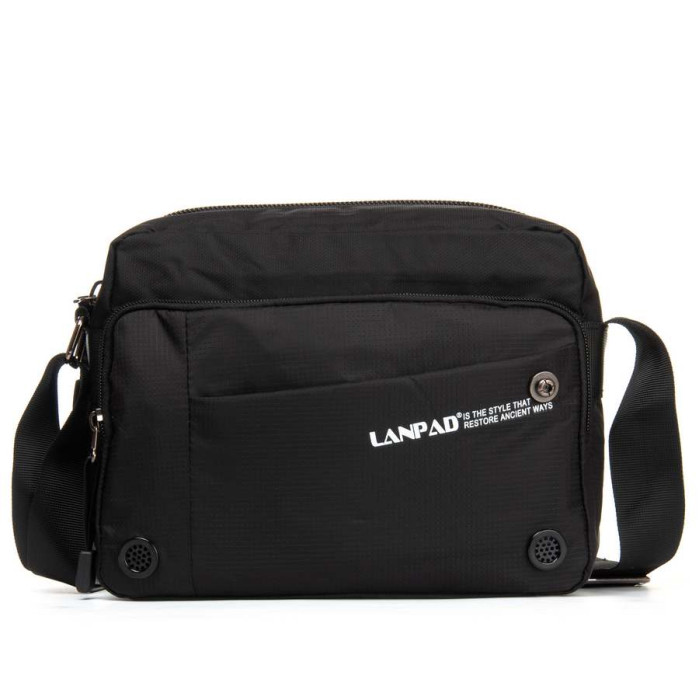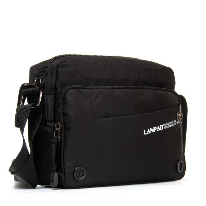 Мужская сумка Lanpad. Одно основное отделение, закрывается на молнию. Внутри отделения есть карман на молнии и открытый карман. На фасаде и обратной стороне расположены карманы на молнии. Регулируемый плечевой ремень шириной 4см..