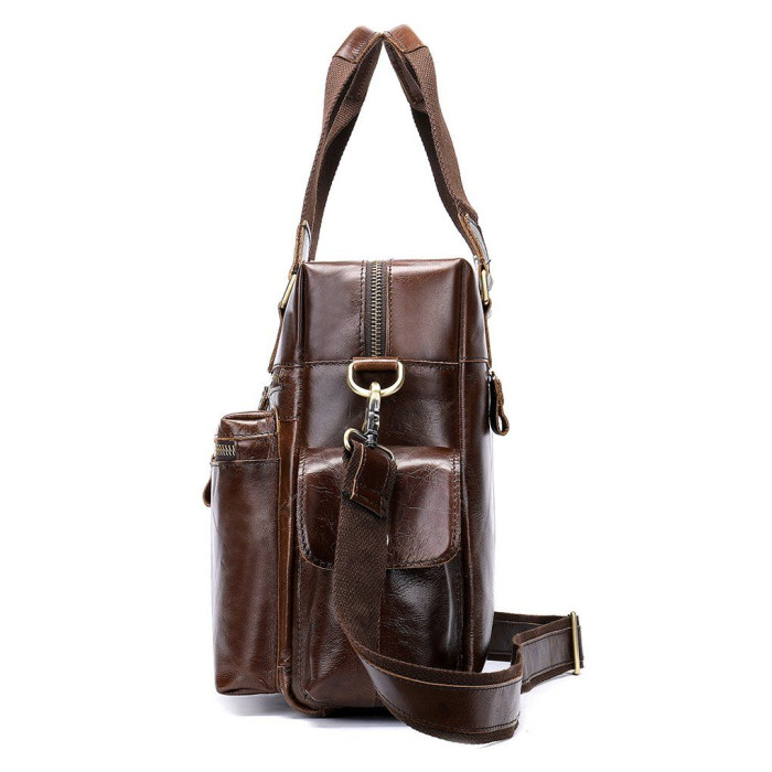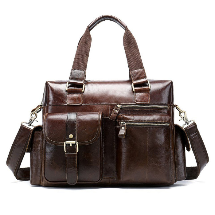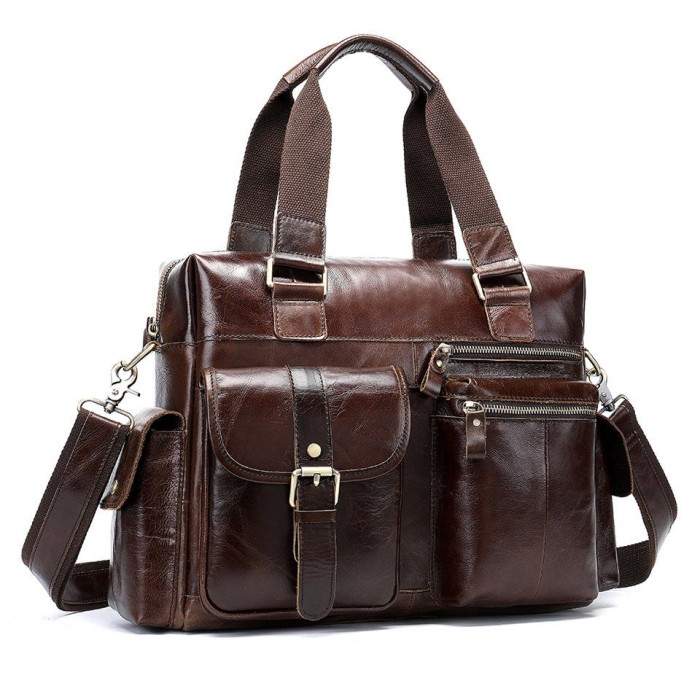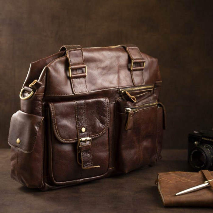 Вместительная сумка для ноутбука из натуральной кожи. Подойдет для встреч и работы. В сумке можно носить папки с документами. Отлично подходит для деловых поездок. Фурнитура в сумке золотистого цвета из крепкого металла. Ее легко носить в руках, так и на плече с помощью съемной ручки. Модель приятная на ощупь и имеет красивый цвет, который переливается на солнце. Аксессуар прошит темно-коричневой нитью. Может быть прекрасным подарком для близкого человека.