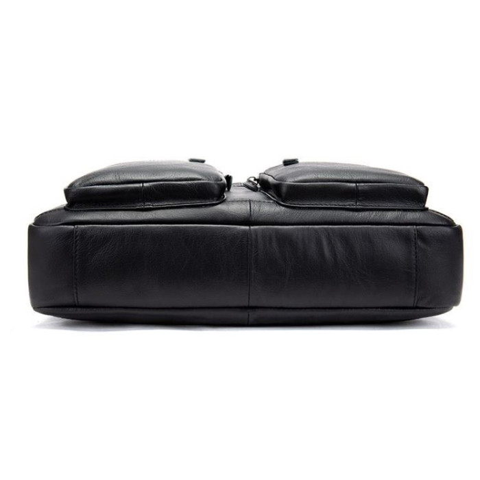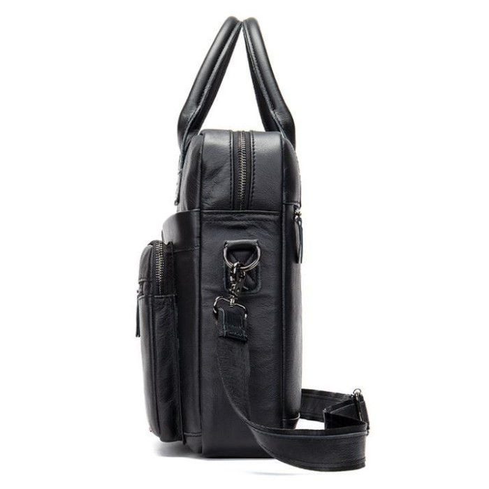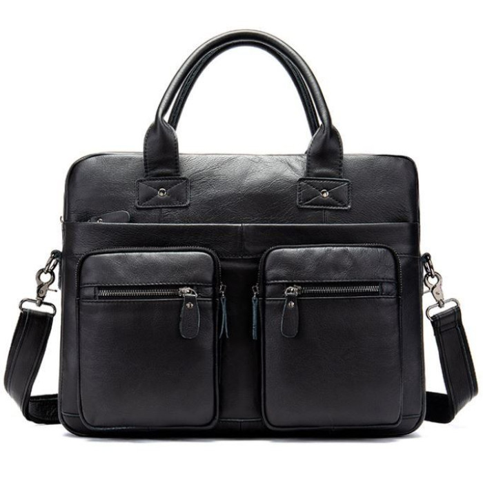 Солидная мужская качественная сумка для деловых мужчин, которые всегда носят все при себе и любят брать с собой ноутбук. Сумку можно носить как в руках с помощью удобных кожаных ручек, так и на плече с помощью съемного текстильного ремешка с кожаной вставкой. Сумка обладает классическим дизайном и универсальным черным цветом. Аксессуар дополнен фурнитурой цвета темного серебра. Сумка по краям прошита ровной черной строчкой. Торчащих ниток нет. Будет прекрасным подарком для близкого человека.