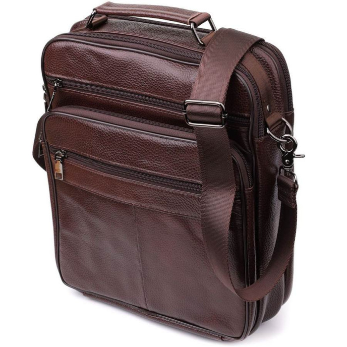 Стильная мужская сумка выполнена из прочной натуральной зернистой кожи флотар, которая отличается выраженной текстурой и высокой износостойкостью. Элегантный внешний вид дополнен фурнитурой цвета серебра, придающей модели сдержанный стиль.