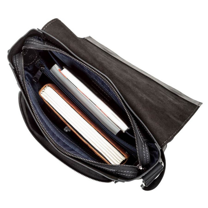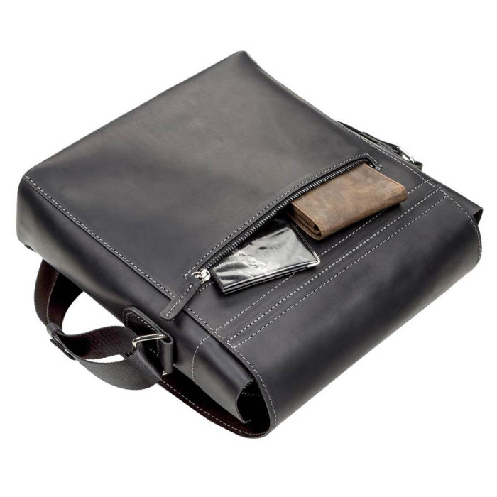 Снаружи: на передней стенке расположен накладной карман на змейке, на задней стенке плоский карман на молнии. Подкладка выполнена из прочного материала, в наличии плечевой ремень. Сумка прошита прочной серой нитью, что придает ей прочности и оригинального вида. Изделие закрывается на молнию и клапаном сверху. Аксессуар упакован в пылезащитный чехол.