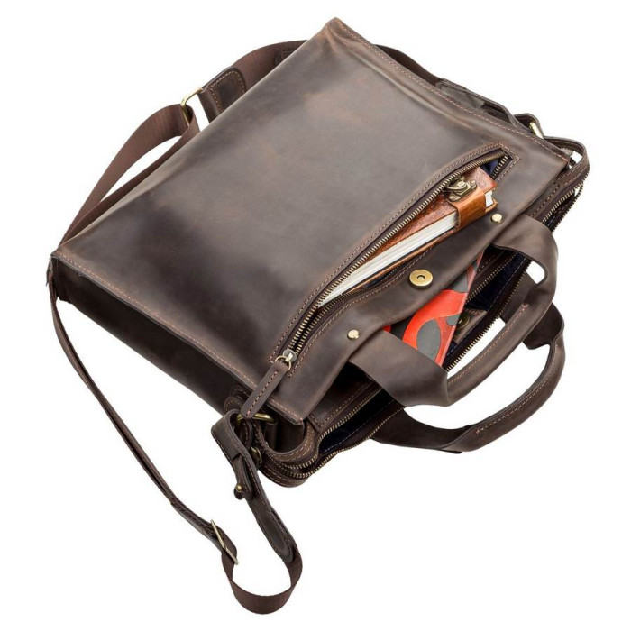 Стильная, современная мужская сумка формата-А4, с двумя удобными ручками, для повседневного использования, позволяющая носить с собой папку с документами, личные вещи. Аксессуар выполнен из натуральной винтажной кожи, характерными признаками которой, являются: неоднородность окраса и потертости, которые придают изделию изысканного, индивидуального вида. Внутри – боковой карман на змейке, два небольших кармана для телефона, мелочей и ручек, упрочненное отделение под планшет.