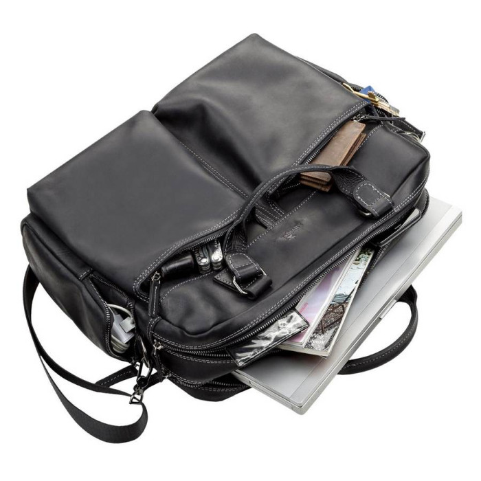 Внутри – первого отдела боковые кармашки для телефонов, ручек и разных личных мелочей, внутри второго: отдел на молнии для ноутбука или планшета, держатель для ключей. Снаружи – на передней стенке большой два накладных кармана на молниях, на задней стенке карман на молнии. По бокам два кармашка на змейках. Подкладка выполнена из прочного материала, в наличии съемный плечевой ремень. Аксессуар упакован в пылезащитный чехол.