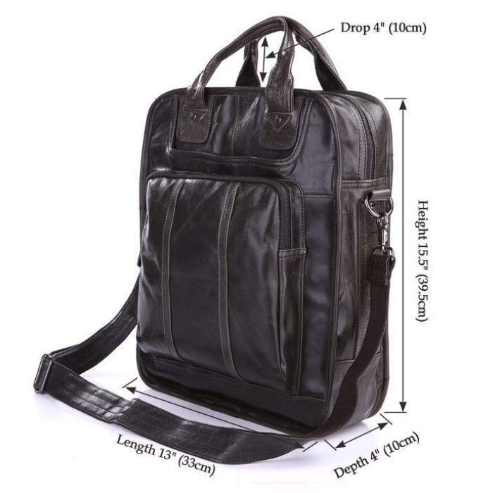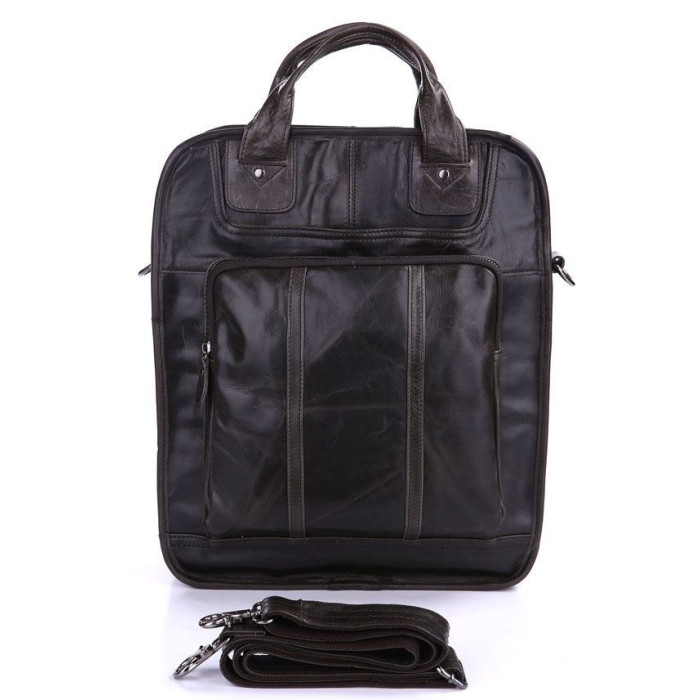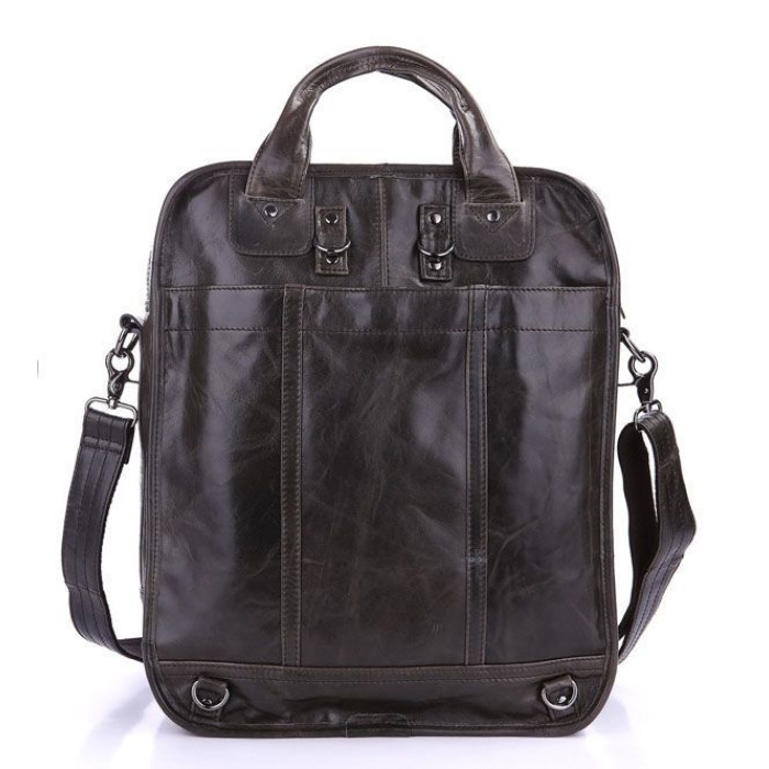 Вертикальная кожаная сумка трансформер из натуральной кожи темно-серого цвета. Сумку можно носить в руке, через плечо и за спиной как рюкзак. На лицевой стороне сумка имеет большое отделение кармана на молнии, за которым прячется большой потайной карман на магнитной кнопке. На задней стороне сумка имеет огромный накладной карман на магнитной кнопке. Внутренний отсек сумки закрывается на молнию. Внутри есть карман на молнии и два накладных кармана для телефонов.